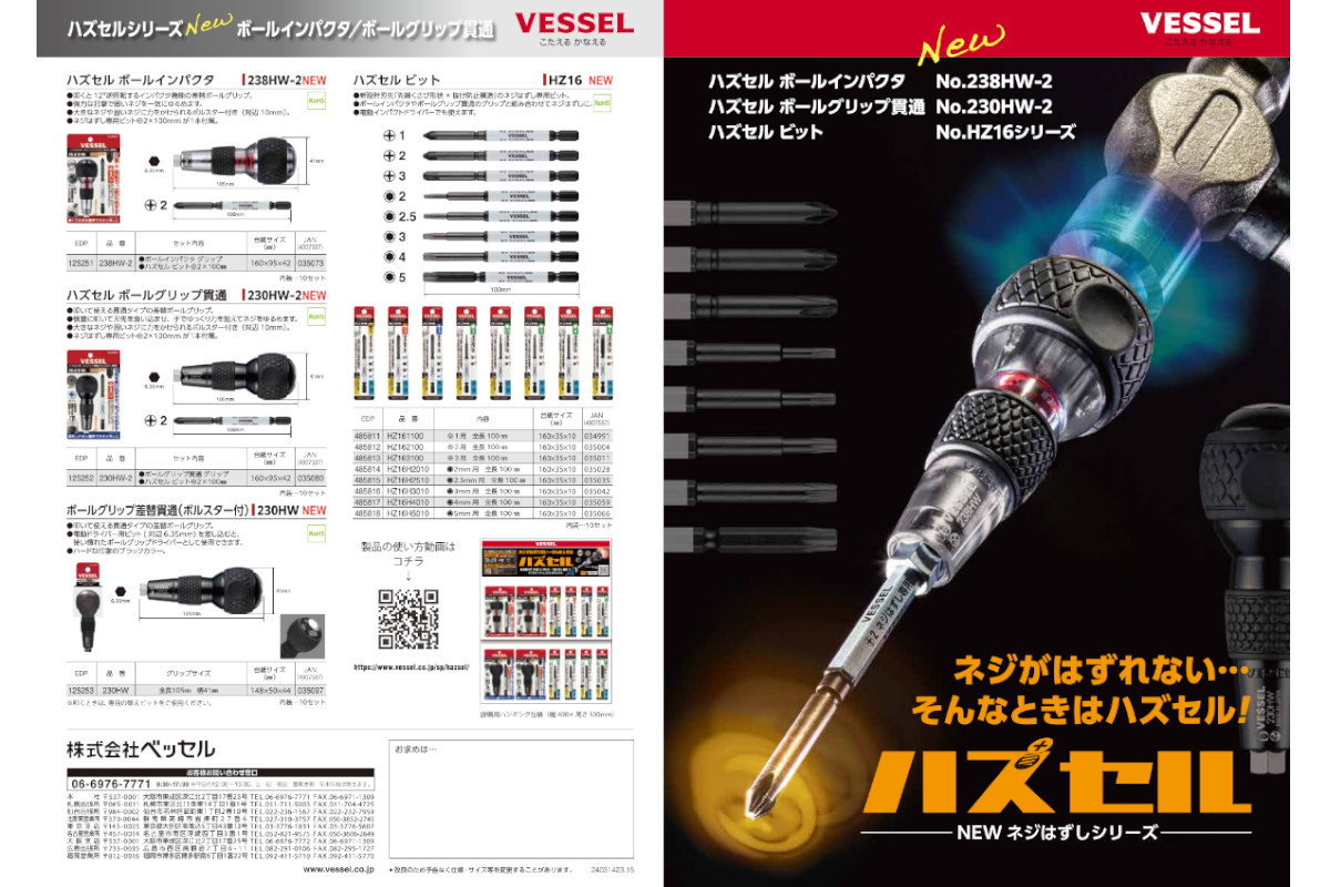 ●電動インパクトドライバーでも使えます。VESSEL(ベッセル) No.HZ162100 ハズセルビット (+)2x100 ◇