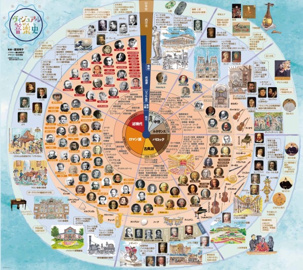 円形でデザインしたポスタ-「ヴィジュアル音楽史」.時系列が視覚的に把握できること,また「音楽史」「世界史」「日本史」が一望できることなどにご好評いただいております.これまでの「ピアノ作曲家ツリ-」「音楽地図」のポスタ-と比べても,格段に情報量が多いので,眺めるたびに新しい発見があり,飽きることがありません.音楽高校にも掲示され,生徒さんたちに喜ばれているとの嬉しいお声もいただいています.皆様のお近くにもぜひどうぞ!(監修:湯浅玲子)