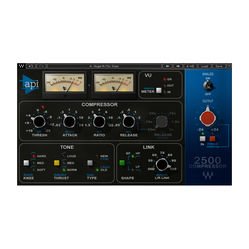 API 2500はパンチ感とAPI独自のト-ンを得られる,ダイナミクス・プロセスツ-ルです.デュアルチャンネル・デザインにより,2500は1つのコンプレッサ-設定で2つの独立したモノ・チャンネルとして動作させることができます.