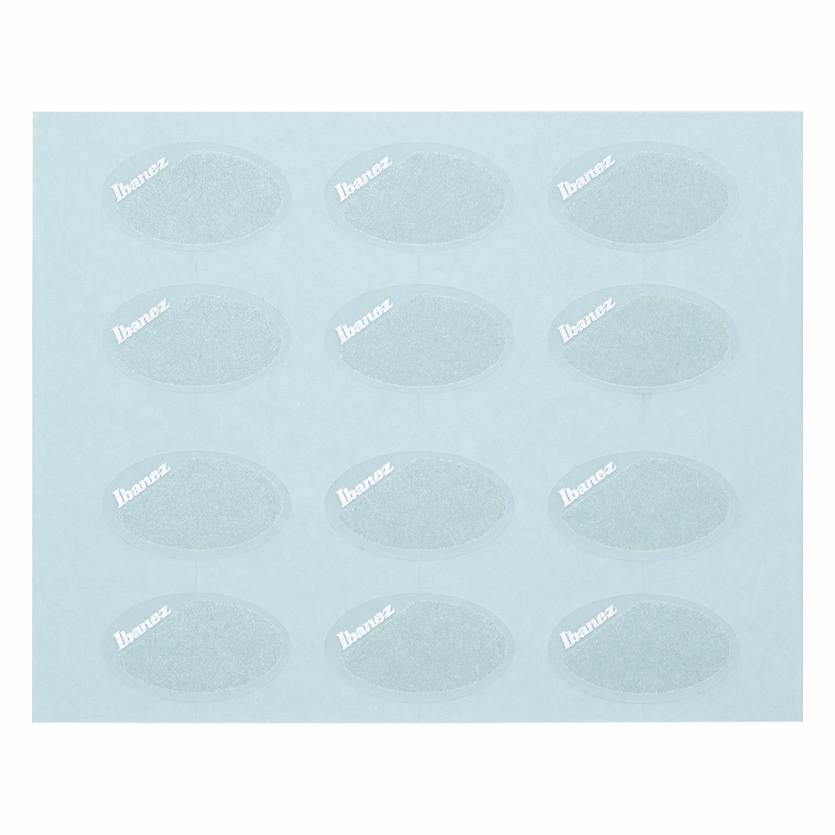 粒子の細かなグリップ部を備えるオ-バル形状のシ-ル左上には,極小のIbanezロゴをさりげなくあしらっています.1シ-トに12枚のシ-ルをセット,裏表に貼るならピック6枚分です.(貼り直しはできません)