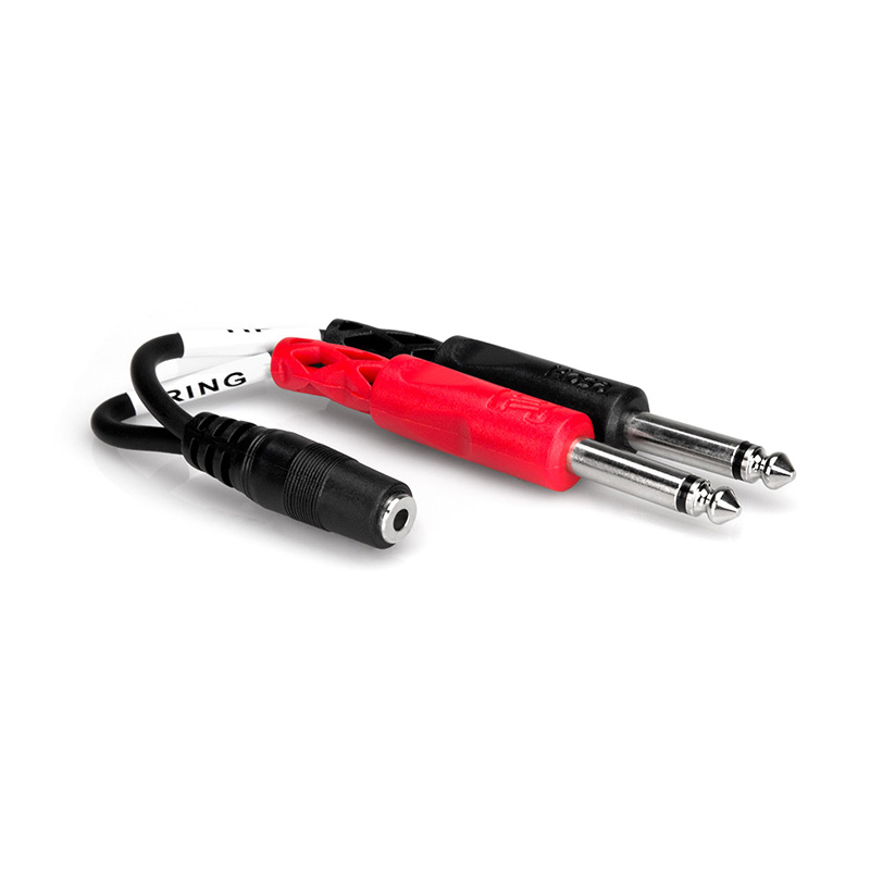 HOSA YMP-434 は,ステレオミニメス(3.5mm TRS)とモノラルフォンオス(1/4 TS)×2を採用した変換ケ-ブルです.ステレオミニからのステレオ信号をモノラルフォンのLRに変換できる便利なケ-ブルです.