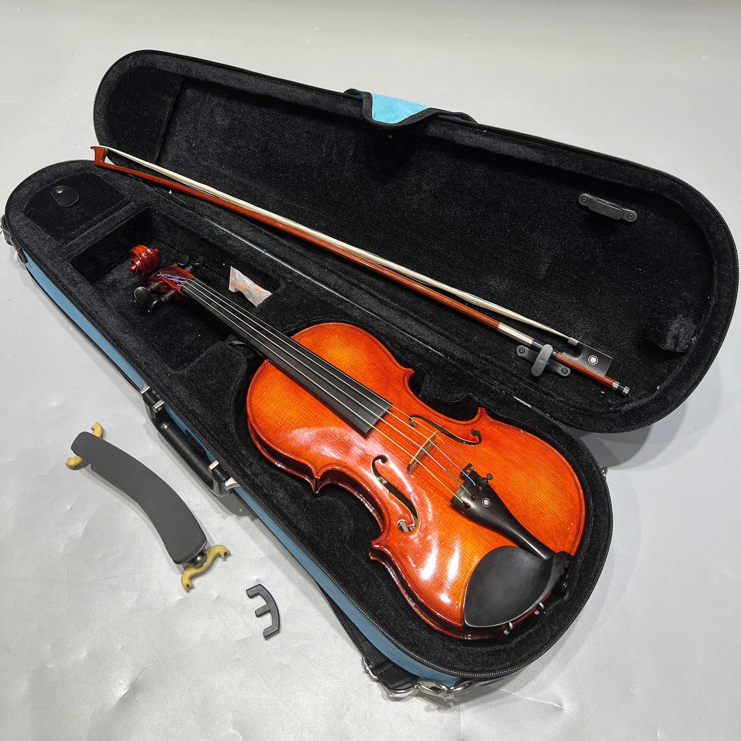 本体使用感・傷多数あり、指板にマスキングテープが貼られた跡が若干残っています。画像参照。弦、弓は交換せずそのままのお渡しとなるため特価となります。ケース、弓、肩当て付属。現品画像