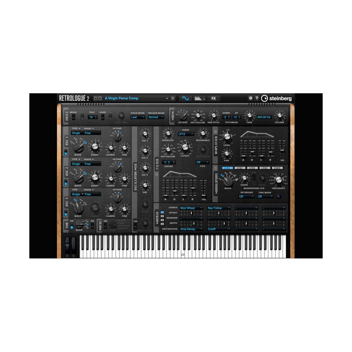 柔軟で直観的な操作性を備えた Retrologue 2 は,アナログシンセが持つ温かみのある図太い音を再現します.3つのバ-チャルアナログオシレ-タ-,ファ-ストクラスのフィルタ-,フレ-ズを自在に作り出すアルペジエ-タ-,パワフルなモジュレ-ションシステムを装備.豊かで創造意欲を掻き立てるサウンドを作りだします.