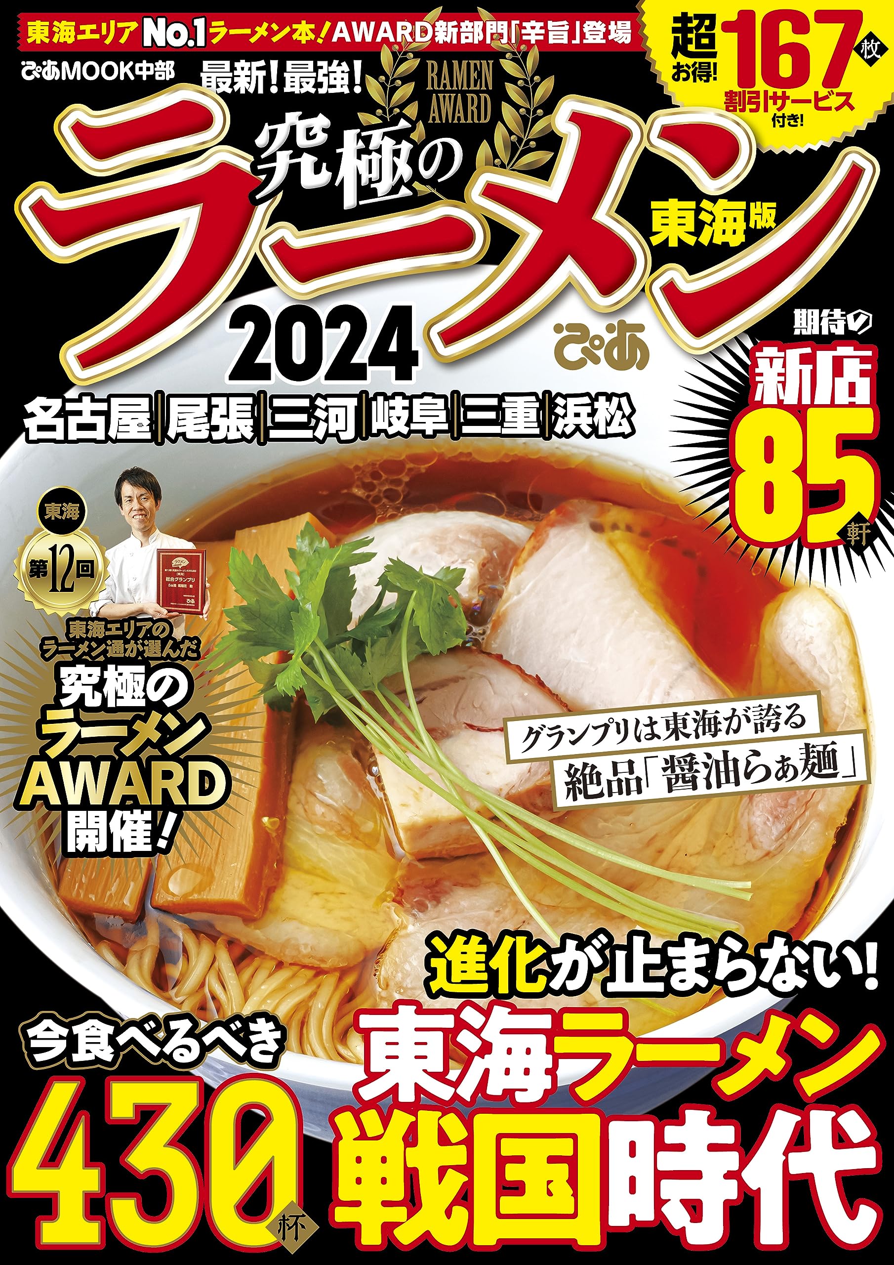 | 商品の説明 (新品の場合) | 東海エリアNo.1ラーメン情報誌、今年も発売! AWARDに東海ならではの「辛旨部門」新設。 半額クーポン10店、1年間使える特典パスポート「麺パス」67店対応!! 名古屋・尾張・三河・岐阜・三重・浜松のブロックに分けて、430杯のラーメンを掲載。 期待のニューオープン店85軒もしっかりフォロー。読者特典の充実ぶりも自信アリ! 通常のクーポン90枚に加え、半額クーポン10店、購入者なら一年間何度でも使える特典パスポート「麺パス」も67店が対応しています。第12回を迎えた恒例の「究極のラーメンAWARD」では、あの醤油らぁ麺の名店がついにグランプリ受賞! 東海ならではの麺文化とも言える「辛旨部門」も新設してますます注目度アップです! = CONTENTS = 【 巻頭企画 】 2024年9月末日まで使える特典満載。 究極のクーポン/半額クーポン/麺パス 【 特集 】 第12回 究極のラーメンAWARD[東海] ・グランプリ ・新店部門 ・醤油部門 ・塩部門 ・味噌部門 ・鶏白湯部門 ・豚骨部門 ・MIX部門 ・濃厚系つけ麺部門 ・清湯系つけ麺部門 ・辛旨部門 ・煮干し部門 ・ラーメンAWARD総評 ・殿堂店、今秋からの注目メニュー ●究極のラーメン厳選カタログ2024 名古屋/尾張/三河/岐阜/三重/浜松 麺探MAP2024 エリア別INDEX 読者プレゼント |