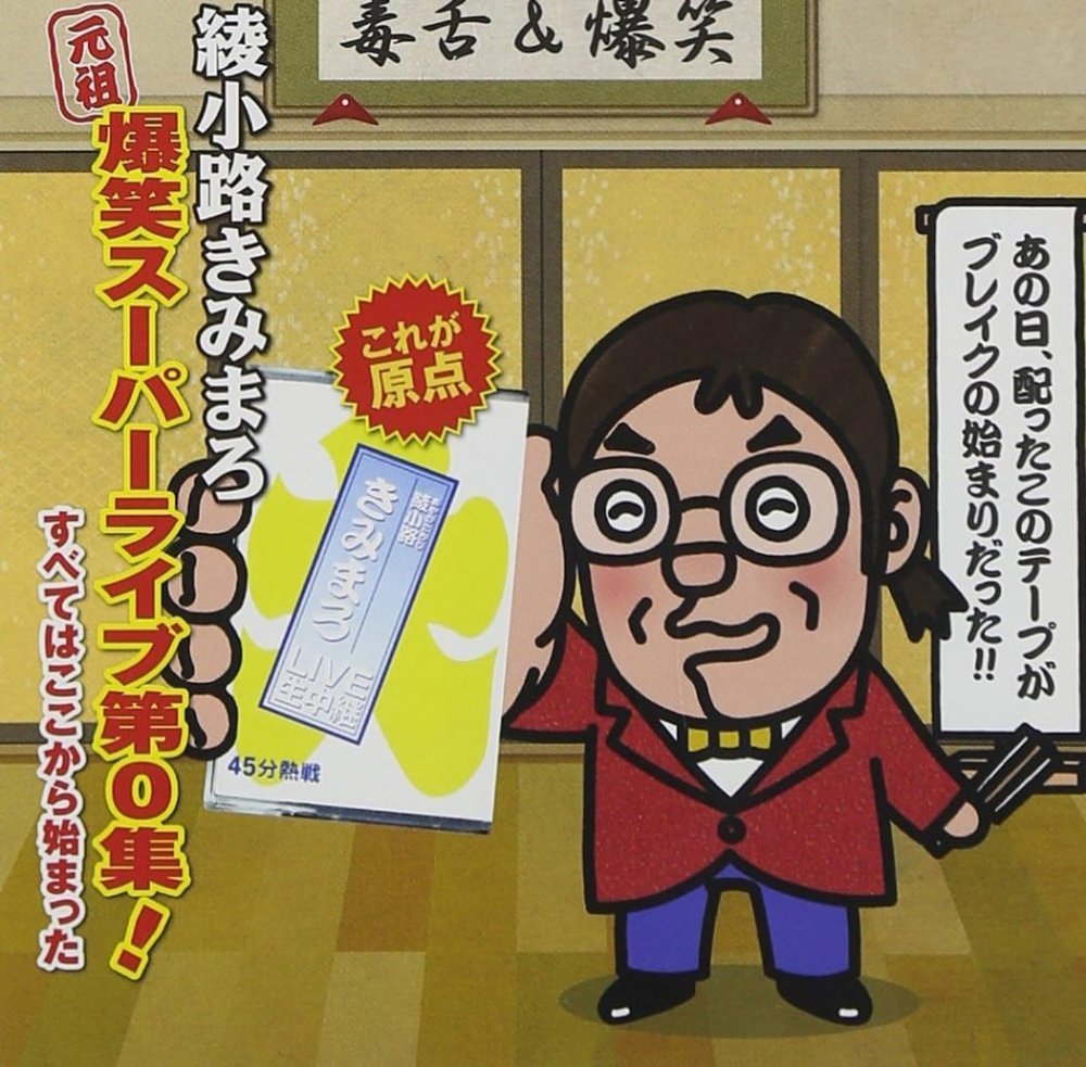 綾小路きみまろが高速道路のサービスエリアで観光バスに配っていたという伝説のオリジナル・カセットテープ『綾小路きみまろ LIVE 生中継』をそのまま収録した作品。 (C)RS 「主な仕様」
