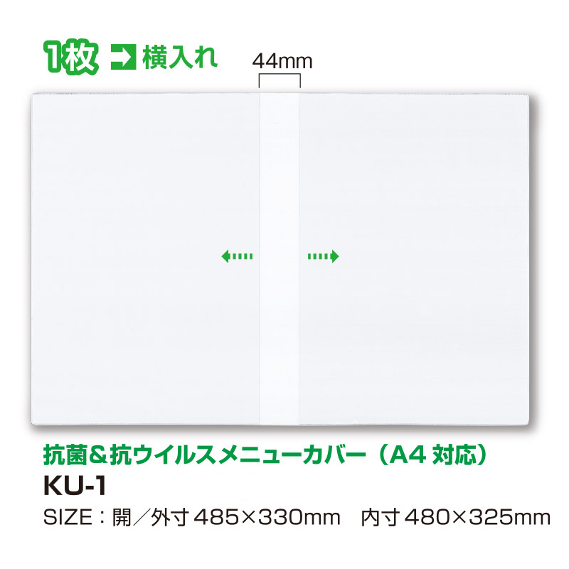 お使いのメニューブック(A4サイズ)に抗菌・抗ウイルスメニューカバーとしてお使いいただく事でメニューブックが衛生的に保たれます。