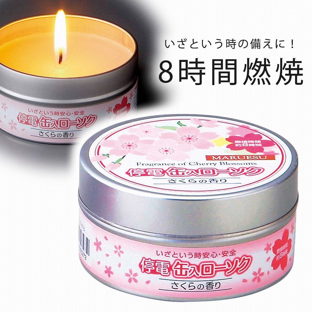 | 商品説明 | さくらの香り入りでリラックス。いざという時に備えておきたい停電ローソク。燃焼時間約8時間。缶入りなのでローソクが倒れにくい構造です。 |