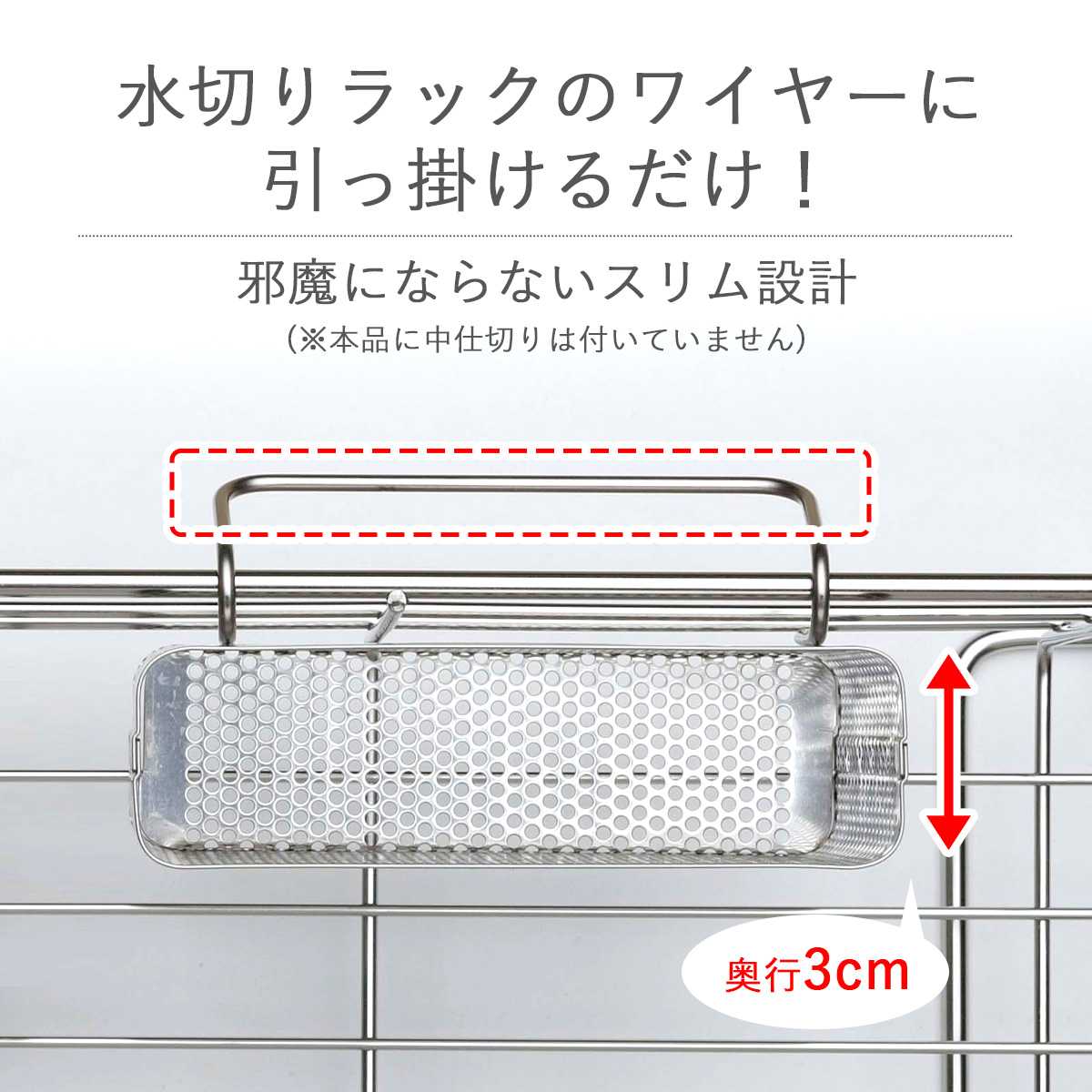 | 商品説明 | 奥行きわずか3cm!水切り内で邪魔にならない。一般的な箸立てよりも1〜2cm薄いので、水切りに皿が1〜2枚多く入ります。プラスチック製の水切りにも使えるよう、引っ掛け部は余裕あるすき間に。薄型でも縦長なので箸・スプーン・キッチンツールが楽々入ります。 |