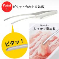 ![]() | ピタッと合わさる先端 薄切り肉も 1枚ずつ剥がして掴める 先端のピッタリ合わせがしっかり食材をつかみます。内側に凹凸の溝があるので、すべりにくく落としません。お肉同士がくっついてしまいがちの豚の薄切り肉も、1枚1枚剥がして掴める菜箸みたいなトングです。 |