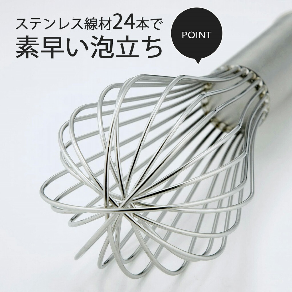 ![]() | プロ仕様! とにかく泡立てが早い 線材の数は多いほど泡立ちが早い。この泡立て器は24本の線材でできています。なめらかに泡立ち、ダマにならずに素早く混ぜることができます。 |