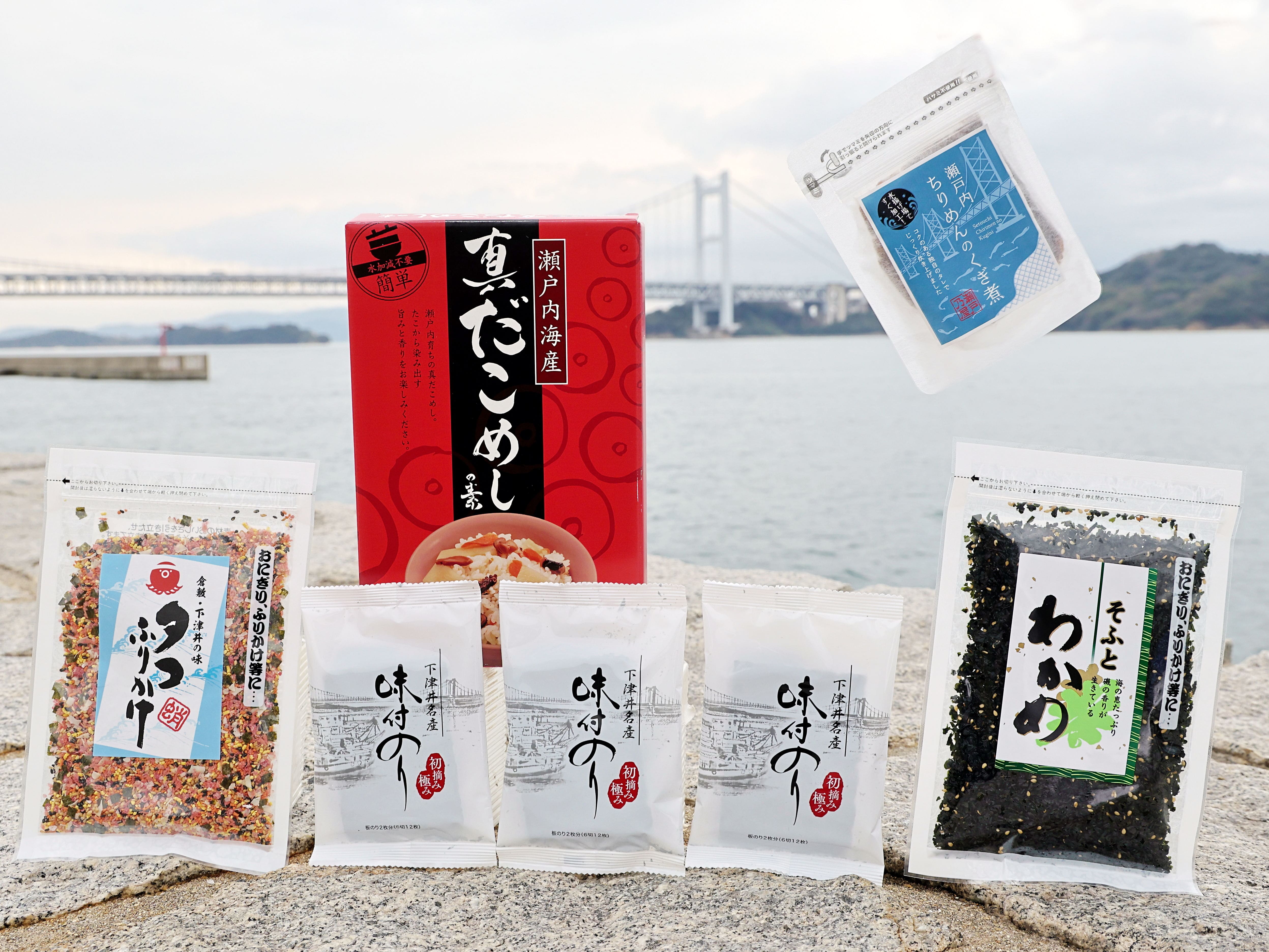 ちょっと変わった蛸ふりかけ!こんなふりかけが出来上がりました!その名も「タコふりかけ」フリーズドライのタコや、カツオ節など海の幸がぎっしりつまった、ふりかけとなっています。アツアツのご飯の上にのせて、食べるのにはぴったり!お茶漬けでも楽しめます!品名:たこふりかけ原材料名:炒りごま(国内製造)、卵風味顆粒(乳糖、コーンスターチ、卵黄末、砂糖、その他)、ポテトフレーク、鮭風味顆粒(乳糖、砂糖、食塩、鮭パウダー)、パン粉、乾燥たこ風味かまぼこ(鱈すり身、澱粉、その他)、たらこ風味顆粒、砂糖、食塩、のり、澱粉、発酵調味料、乾燥タコチップ、魚醤、和風調味料、デキストリン、野菜エキス、酵母エキス/調味料(アミノ酸等)、加工澱粉、ソルビット、着色料(カロチノイド、紅麹、カラメル)、香料、酸化防止剤(V.E)、(一部に卵・乳成分・小麦・かに・いか・さけ・さば・大豆・豚肉・ごまを含む)内容量 80g保存方法:直射日光をさけ、なるべく乾燥した場所に保存してください。栄養成分表(100g当たり)¥エネルギー:417kcal、たんぱく質:15.8g、脂質:14.2g、炭水化物:56.4g、食塩相当:9.4g、カルシウム260mg※倉敷市下津井産一番のりを使用名称:味付のり原材料名: のり(岡山県産)、砂糖、蛋白加水分解物、醤油(本醸造)みりん、食塩、海老、かつお削り節、ビーフエキス、でんぷん分解物、昆布、酵母エキス/ 調味料(アミノ酸等)、甘味料(甘草、ステビア)、香辛料抽出物、(一部にえび・小麦・大豆・牛肉を含む)内容量:板のり2枚分(6切12枚)×3袋栄養成分表示(100g当たり)エネルギー 108kcal たんぱく質 12.0g 脂質 1.1g 炭水化物 12.5g 食塩相当量 1.3g※この表示値は目安です。※そふとわかめふりかけは、1975年から販売しています。名称:そふとわかめ原材料名:わかめ(中国)、砂糖、食塩、ごま、しその実/調味料(アミノ酸等)、シソ香料、酸味料内容量:80g栄養成分表示100g当たり 熱量 226kcal たんぱく質 14.3g 脂質 1.2g 炭水化物 34.3g 食塩相当量 13.5g※この表示値は目安です。名称:佃煮(ちりめんのくぎ煮)原材料名:いわし稚魚(兵庫県明石沖産)、砂糖、発酵調味料、しょうゆ、生姜、水飴、清酒、醸造酢、酵母エキス/アルコール、(一部に小麦・大豆を含む)内容量:70g保存方法:常温で保存栄養成分表示(100g当たり、推定値)エネルギー:163kcal、タンパク質:6.3g、脂質:0.4g、炭水化物:32.2g、食塩相当:1.7g※いわし稚魚はエビ・イカの混ざる漁法で漁獲しています。※開封後はお早めにお召し上がりください。名称 魚介類加工品(真だこめしの素)原材料 「たこ(タレ込み)」たこ(国産)、しょうゆ、米発酵調味料/トレハロース、増粘剤(加工でん粉)「野菜調味液」人参、たけのこ、米発酵調味料、しょうゆ、食塩/調味料(アミノ酸)、 (一部に小麦・大豆を含む)内容量 たこ・90g(タレ込み)、野菜入り調味料・440g、たこ(タレ込み)栄養成分表示1袋(90g)当りエネルギー87kcal・タンパク質13.5g・脂質0.4g・炭水化物6.0g・食塩相当3.4g(これは目安です。)野菜入り調味液栄養成分表示1袋(440g)当りエネルギー82kcal・タンパク質3.3g・脂質0.2g・炭水化物15.1g・食塩相当5.7g(この表示は目安です。)