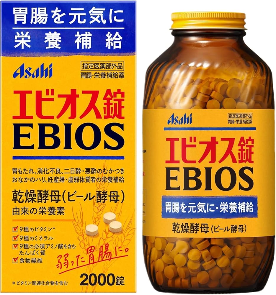| 商品の説明 | 商品の説明 指定医薬部外品 【効能・効果】食欲不振(食欲減退) 胃弱、胃部・腹部膨満感、消化不良、食べすぎ、飲みすぎ、胸やけ、もたれ(胃もたれ)、胸つかえ、はきけ(むかつき、二日酔・悪酔のむかつき、悪心)、嘔吐、栄養補給、妊産婦・授乳婦・虚弱体質者の栄養補給、栄養障害 原材料・成分 【1日量(30錠)中の成分】乾燥酵母7125mg 添加物として乳糖、リン酸水素カルシウム、無水ケイ酸、硬化油を含有。 エビオス錠は帯黄白色〜微黄褐色で酵母特有のにおいと味を有する錠剤です。 *本製剤は天然物を原料としておりますので、味・色・においに多少の変動がある場合もありますが、服用に差し支えありません。 使用方法 次の分量を1日3回、食後に服用してください。15歳以上 1回 10錠、 11歳以上15歳未満 1回 8錠、 7歳以上11歳未満 1回 5錠、5歳以上7歳未満 1回 3錠 安全警告 医師の治療を受けている人。 1ヶ月位服用しても症状の改善がみられない場合。 3.定められた用法及び用量を厳守してください。 4.小児に服用させる場合には、保護者の指導監督のもとに服用させてください。 5.本剤は、(錠剤をのどにつまらせてはいけませんので)5歳未満の乳幼児に服用させないでください ご注意(免責)>必ずお読みください 合計8,000円以上(税込)お買上げで全国送料無料!! 登録販売者名:上田 奈弓 連絡先045-367-1095 緊急連絡先:045-367-1095(営業時間外転送) 営業時間:10:00〜19:30(日曜日、祝祭日を除く。) |