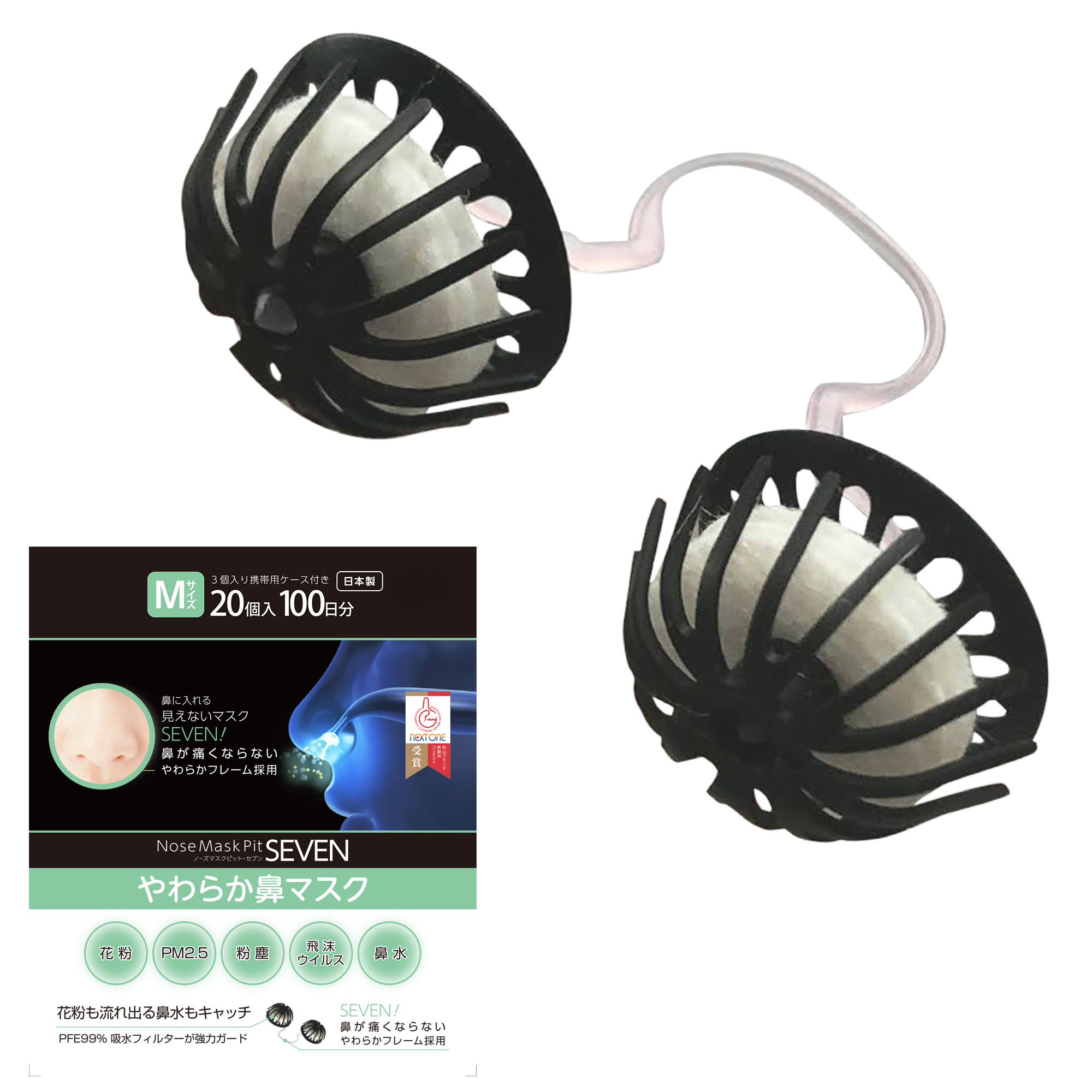 鼻に入れても違和感が出ない柔らか素材 ほとんどの人が鼻にモノを入れて生活をした事がありません。その為、ノーズマスクピットSEVENを挿入直後、違和感を感じると思います。その違和感を軽減する為に各パーツの素材にこだわりました。特に従来品でお客様の要望が多かった「硬いフレーム」と「鼻水を何とかしたい」の声を反映致しました。それにより装着後の違和感は時間とともに薄れていきます。 見えない気付かれないフレーム設計 鼻に入れるマスクだから目立ってはダメ。ノーズマスクピットSEVENを装着している事が誰からも気付かれない様にカバー・フレームの形状・色・形を設計しました。 花粉など0.1μm以上の超微粒子の侵入を軽減するPFE99%フィルター 体内に花粉を通さない為のフィルター。PFE99%(試験証明取得)フィルターを3枚に重ね、通気性を損なう事無くより花粉の捕集効率をアップさせました。 水分を吸収するPFE99%フィルター PFE99%に加えフィルターに吸水性を持たせ、3重にしています。フィルター自体の吸水性と3重にする事でフィルターの隙間で水分を吸収、受け止めます。 洗って繰り返し使えて経済的 1日2回の水洗いで5日間使用可能です。ノーズマスクピットSEVENのフィルターは10回までの洗浄ならPFE99%の性能は落ちません。(10回洗浄試験済) ノーズマスクピットSEVENのサイズは2種類 SサイズとMサイズの2サイズ。Sサイズは主に女性向け。Mサイズは主に男性向け。通常のマスクをしていない時も鼻をガードします。今現在、口鼻を覆うマスクの着用はほぼ必須です。ただマスクをしたままでは出来ない事も有ります。例えば食事です。マスクを外しても口は閉じれば外気を吸う事はありませんが、鼻は無防備なままになります。食事をしながらでも、自然に鼻から呼吸を行い、何もして無ければ食事中に鼻から花粉を吸い込む事も。いろんなシーンで無防備になる鼻をノーズマスクピットSEVENがガードします。 ゴルフなどのスポーツ時も装着可能です 従来のノーズマスクピットをスポーツの時に使われている愛用者の方も非常に多く特にゴルフや自転車、トレッキングやウォーキングなど。スポーツ中でも、空気中の目に見えない花粉・PM2.5・飛沫ウィルス・黄砂などPFE99%フィルター(0.1?までの微粒子をカット)が鼻をしっかりガードいたします。※激しいスポーツには向きません。 |