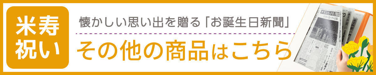 米寿祝いに「特別感のある贈り物をしたい」という方に大人気なのが、生まれた日に発行された『お誕生日新聞』 こちらの商品は、お誕生日新聞をラミネート加工しているため、色あせや折れを防ぎ、いつまでも綺麗に保存できます。 男女問わず喜ばれ、お祝いの席でも盛り上がること間違いなし。心に残る米寿のギフトをお探しの方にぴったりです。 |