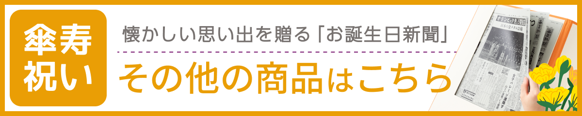傘寿祝いにぴったりの特別ギフト、『お誕生日新聞』 生まれた日と成人した日の新聞を2枚セットにし、オリジナルファイルに美しく包装してお届けします。 普段は見ることができない“あの日の出来事”に触れられるため、サプライズプレゼントとして大人気。