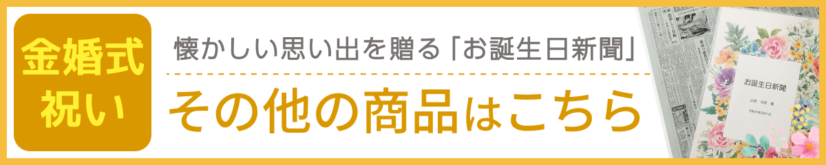 金婚式のプレゼントにぴったりの「お誕生日新聞ポケットファイル」 「50年前の結婚記念日」から10年毎の結婚記念日に発行された新聞をセットにし、上品なオリジナルファイルにまとめました。家族の人生を振り返る特別な贈り物としてぜひご利用ください。 |