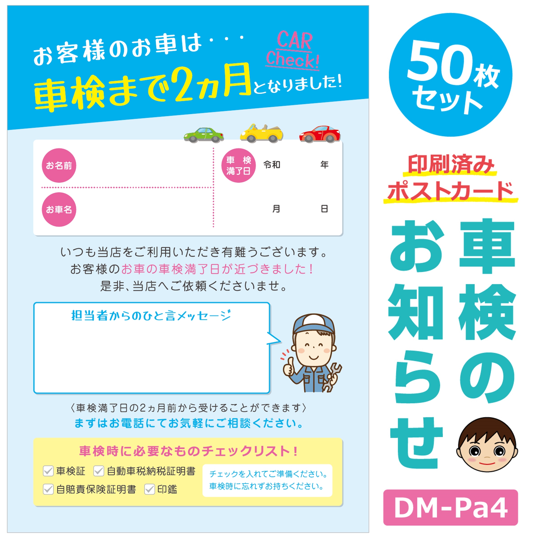 DM‐Pa4 50枚セット「車検のお知らせ」ポストカード 車検2ヵ月前 印刷済み ハガキタイプ DM 販促