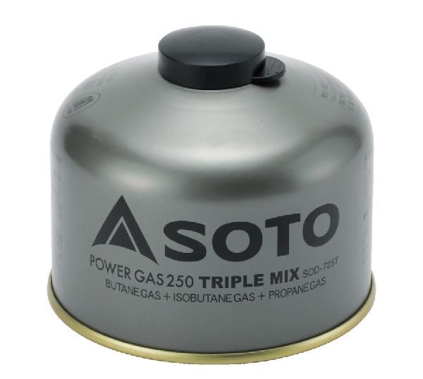 プロパン、イソブタン、ノルマルブタン3種混合のトリプルミックスパワーガス。(OD缶タイプ)<br>■製品仕様■<br>●寸法/直径110X高さ90mm <br>●重量/385g <br>●NET/230g <br>●成分/液化プロパン,液化イソブタン,液化ブタン
