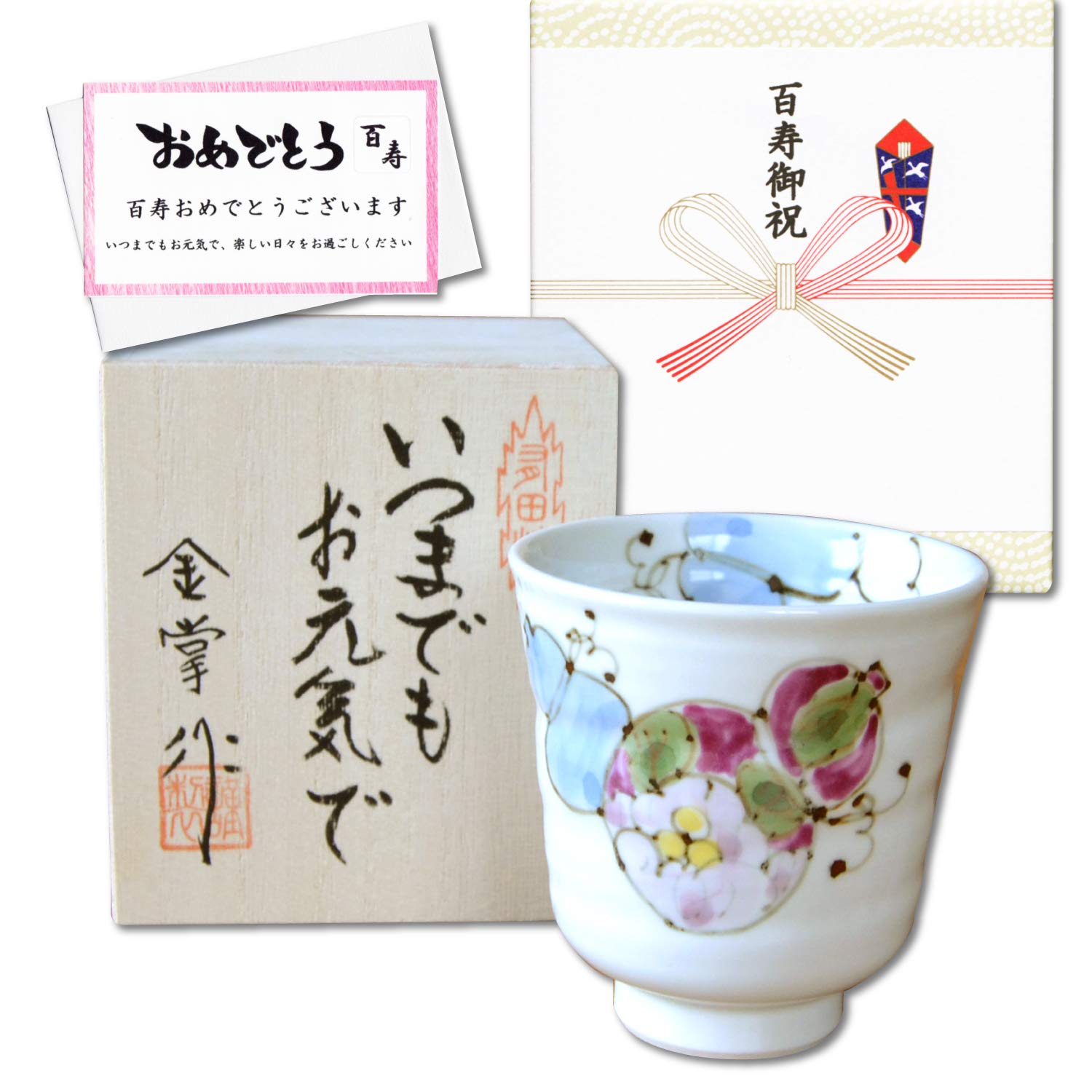 百寿のお祝い 100歳 無病息災を願った縁起物ギフト 有田焼 湯呑み 花六瓢 青 百寿熨斗・メッセージカード付き 木箱入り