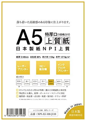 日本製紙 特厚口 NPI上質紙 A5 100枚 日本製 白色度88% 紙厚0.148mm 四六判表記110kg NPI-A5-100-J110