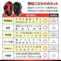 ・ミットについてミットで最も重要な機能衝撃吸収力打ち込みやすさ受けやすさにフォーカスし、独自開発したアーチ状のオリジナルパッドを採用しています。練習中に手から外れないよう、手首部分には面ファスナーでしっかりと固定できるようになっています。カーブ形状により、拳が当てやすく練習にピッタリです。また、通