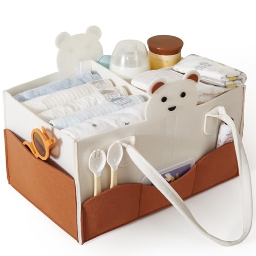 Sunveno 可愛なフェルト製ベビー用品収納バスケット&おむつポーチ、取り外し可能な内部デザイン、折りたたみ可能、家庭、車、外出に便利