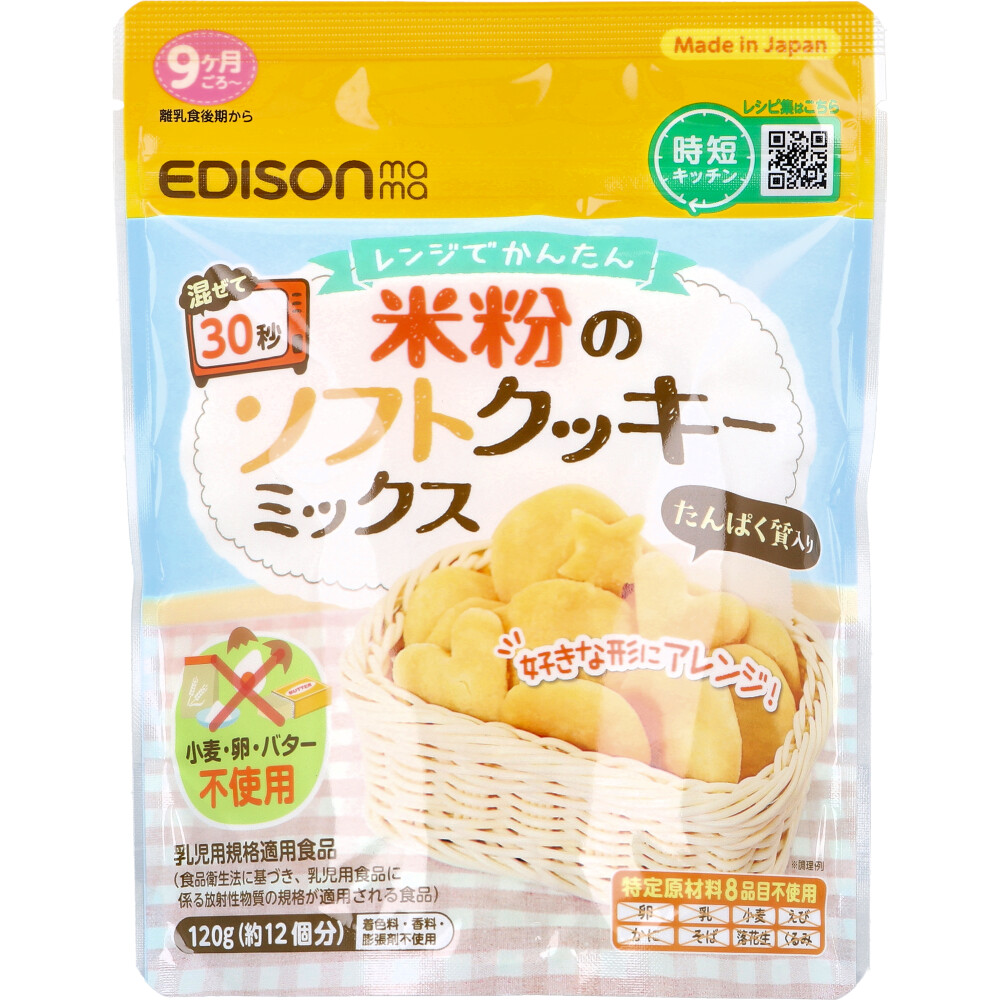 【商品仕様】【名称】ソフトクッキーミックス【原材料名】うるち米(国産)、アーモンド、含蜜糖【栄養成分表示(100g当たり)】エネルギー:413kcaLたんぱく質:9.0g脂質:10.9g炭水化物:69.7g食塩相当量:0.02g【作り方】(丸型:直径4cm×2個分)★材料・本品:20g(大さじ2 1/4)・牛乳(または育児用ミルクや豆乳):12mL※育児用ミルクは冷ましてから調理する。(1)ボウルに本品20gと牛乳12mLを入れ、ダマがなくなるまで混ぜる。(2)生地を2等分し、成型する。(3)生地の下にラップを敷いて、レンジで600W30秒加熱する。表面が乾いていれば出来上がり。※やけどに注意!※レンジの仕様によって、出来上がりが異なる場合がございます。加熱が足りない場合は10秒ずつ増やしてください。【保存方法】・直射日光・高温多湿の場所を避け、常温で保存してください。【アレルギー物質】アーモンド【注意事項】【取扱上の注意】・表示している月齢は目安です。お子様の成長に合わせてお召し上がりください。・慣れない頃はミルクなどに浸して食べさせてください。・食べている時や食べ終わった後は、湯冷ましなどを飲ませてください。・お子様に食べさせる際は、温度を確認し適当な大きさにして、食べ終わるまで必ずそばで見守ってください。・お子様が横になっている時やおんぶされた状態の時は、食べさせないでください。のどに詰まるおそれがあります。・開封する際は、指などを傷つけないようにご注意ください。・調理の際は、やけどに十分ご注意ください。・調理後はできるだけお早めにお召し上がりください。食べ残しは食べさせないでください。・原料の収穫時期や加工時期により、色や風味が異なる場合があります。・電子レンジの機種により加熱時間が多少異なります。・電子レンジのオート(自動)機能での加熱はおやめください。・700W以上の調理、加熱のしすぎは発火や風味の変化の原因となります。・パッケージは大切に保管してください。・本品製造工場では、大豆・ごまを含む製品と共通設備で製造しています。★保存上の注意・お子様の手の届かない所に保存してください。・開封後はチャックをしっかり閉じてください。吸湿や虫害などを防ぐため密閉容器に入れて常温で保存し、お早めにご使用ください。・火のそばに置かないでください。袋が溶けてくっつき、粉もれするおそれがあります。【メーカ】株式会社ケイジェイシー【生産地】日本