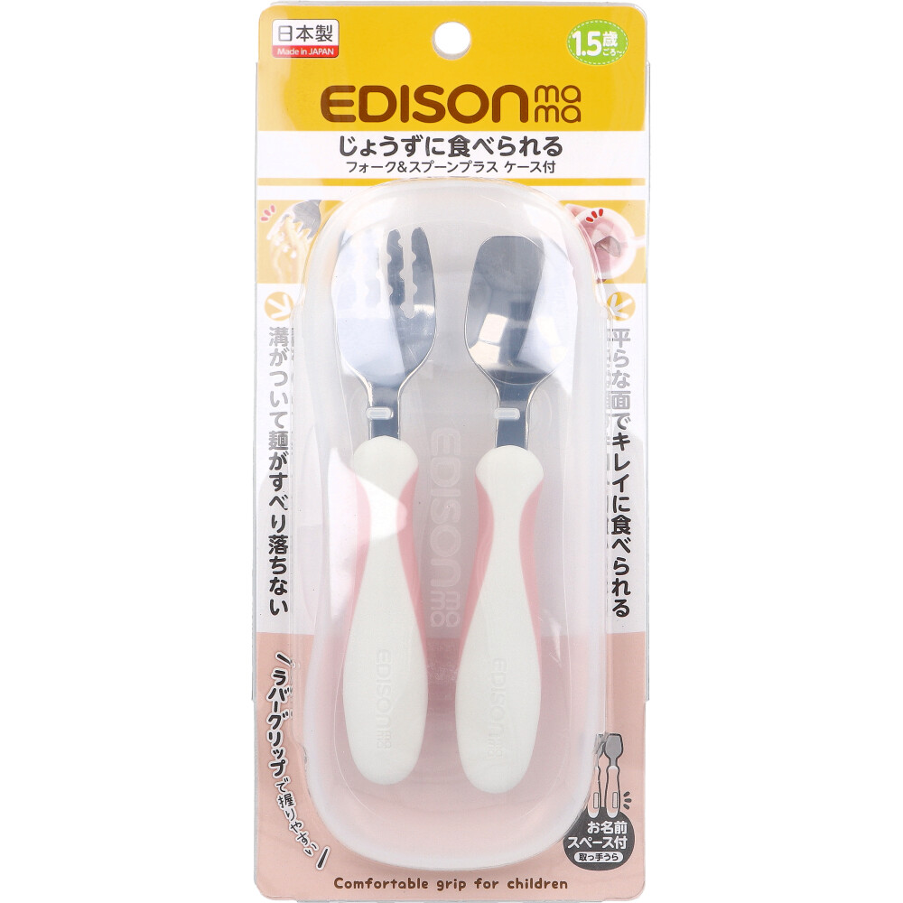 【商品仕様】【商品名】フォーク&スプーンプラス ケース付(品番:KJ3272)【材質】取っ手:ポリプロピレン、熱可塑性エラストマー先端部:ステンレスケース:ポリプロピレン【耐熱温度】取っ手・先端部:140度ケース:120度【消毒方法・洗浄・漂白】・取っ手・先端部:煮沸○、レンジ消毒×、薬液消毒×、食器洗浄機・乾燥機○、漂白×・ケース:煮沸×、レンジ消毒×、薬液消毒○、食器洗浄機・乾燥機×、漂白○【対象年齢】1.5歳ごろ〜【注意事項】【注意】・必ず保護者や指導者の目の届く所でご使用ください。・用途目的以外のご使用はおやめください。・キズ・破損・亀裂・変形などが生じた場合は、すぐにご使用をおやめください。部品などを飲み込まれた場合は、病院や医師にご相談ください。・持ったまま転ぶと、目やのどに当たり思わぬケガをするおそれがあります。・フォークの隙間に舌や歯、指を入れないようにご注意ください。・初めてご使用される前に、必ず洗浄をしてください。・ご使用後は必ず洗浄をしてください。洗浄の際は、柔らかいスポンジと食器用洗剤をご使用ください。磨き粉やたわしなどのご使用はおやめください。・洗浄後はよく乾燥させ、お子様の手の届かない所に保管してください。・麺はフォークの奥までしっかりからませてご使用ください。麺の細さや状態によっては麺が落ちる場合があります。・食品(飲み物・調味料)によっては本製品に色や臭いが付く場合がありますのであらかじめご了承ください。・直火・オーブングリル・電子レンジではご使用いただけません。・火のそばに置かないでください。・塩素や酸などを含んだ汚れが付着したまま放置しないでください。また、鉄やアルミなどの異種金属製品と接触させたまま長時間放置しないでください。・ケースの上に重いものを載せないでください。・ケースを閉める際は、指を挟んでケガをしないようにご注意ください。・落とすなど強い衝撃を与えると破損するおそれがあります。・お名前スペースにシールを貼る場合は、耐水性のある製品をお選びください。また、直接ご記入いただく場合は油性ペンをご使用ください。・使用状況によっては本体からシールがはがれたり、文字がにじんだりする場合があります。表面を強くこすらないようにご注意ください。※使用条件と使用頻度により劣化の時期は異なります。★お手入れ上の注意・煮沸消毒は大きめの鍋にお湯を入れ、鍋の内側に触れないように2〜3分間煮沸してください。・電子レンジ消毒や薬液消毒は各消毒用品の使用方法に従ってください。・食器洗浄機や食器乾燥機をご使用の際は、各使用方法に従ってください。・業務用の食器洗浄機や食器乾燥機でのご使用はおやめください。・漂白の際は台所用酸素系漂白剤を使用し、各使用方法に従ってください。【メーカ】株式会社ケイジェイシー【生産地】日本