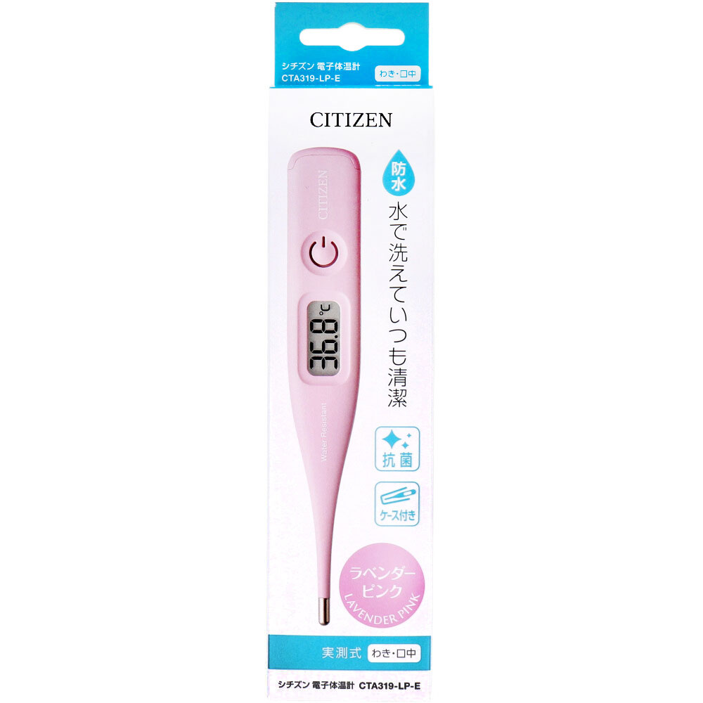 【商品仕様】【管理医療機器】電子体温計医療機器認証番号:230ADBZX00045000(管理医療機器ですが、販売免許の届出がなくても販売可能です。)【販売名】シチズン電子体温計CTAシリーズ【型式】CTA319-LP-E(ラベンダーピンク)【仕様】測定方式:実測式検温部位:わき・口内測定時間:わき下約10分、口中約5分使用電池:LR41電池1個電池寿命:約3年(但し1回10分、1日1回ご使用の場合)体温表示:数字3桁+度測温範囲:32.0〜42.9度付属品:収納ケース、モニター用電池(内蔵)、医療機器添付文書/取扱説明書、保証書/EMC技術資料【注意事項】【注意】ご使用前に、取扱説明書をよくお読みください。付属の電池はモニター用です。【メーカ】シチズン・システムズ株式会社【生産地】中国
