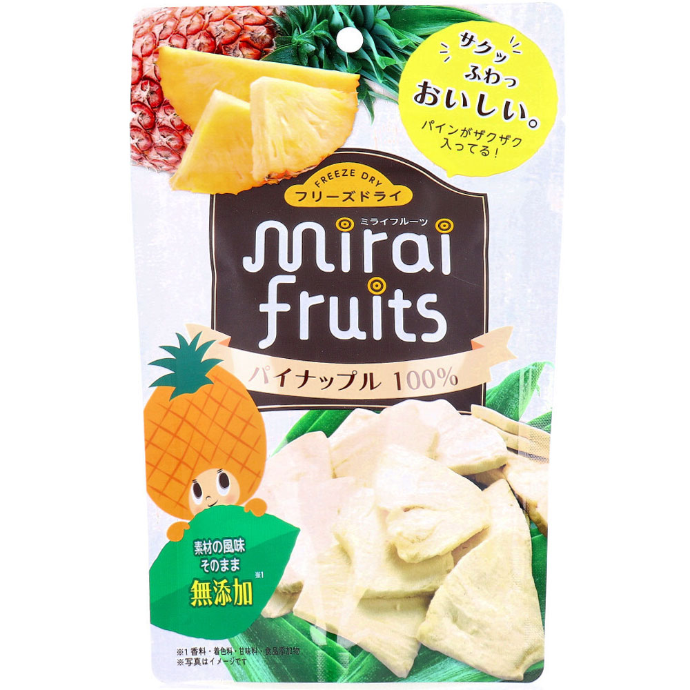 【商品仕様】【名称】乾燥果実【原材料】パイナップル【栄養成分(1袋10gあたり)】エネルギー・・・38kcaLタンパク質・・・2g脂質・・・0g炭水化物・・・9g -糖質・・・6g -糖類・・・6g食塩相当量・・・0g※推定値【月齢】9ヵ月頃から【ミライフルーツの美味しい楽しみ方】・ミライフルーツでステキなティータイムを。ミライフルーツは味だけでなく、見た目も可愛いからお客様へのおもてなしにピッタリ。お気に入りの器に盛りつけるだけで、素敵なティータイムを演出できます。・ミライフルーツを毎日の朝食にプラス。いつもの牛乳に、ヨーグルトに、シリアルに、さっとプラスするだけ!栄養価アップで健康的な一日のスタートをバックアップします!・ミライフルーツでお菓子作り。市販のホットケーキミックスにトッピングしたり、手作りのお菓子のアクセントとして使ってみましょう!アイデア次第でいつものおやつがワンランク上のスイーツに大変身!【保存方法】・直射日光・高温多湿の場所を避けてください。【注意事項】【注意】・本品製造工場では、乳、キウイフルーツ、バナナ、もも、りんご、オレンジを含む製品を製造しています。・果物をそのまま乾燥させているため、色・形・味に個体差があります。・表面に白い粉が付着していることがありますが、果物の糖分ですので安心してお召し上がり下さい。・果物の特性及び製造工程上、まれに表面に褐色や固い部分などが生じる場合がありますが、品質に問題はありません。・水分を吸収しやすい食品ですので、開封後はお早めにお召し上がりください。・初めて赤ちゃんに食べさせる時はアレルギーや消化不良などに気をつけながら少しずつ始めましょう。・繊維部分など、うまく飲み込めない時がありますので、様子を見ながら小さくしたり、水分を与えたりして必ず食べ終わるまで保護者が見守ってください。・横になっているときやおぶっているときなど、のどがつまりやすい姿勢では食べないでください。・アレルギーについてご確認の上、お召し上がりください。【メーカ】株式会社ビタットジャパン【生産地】ベトナム
