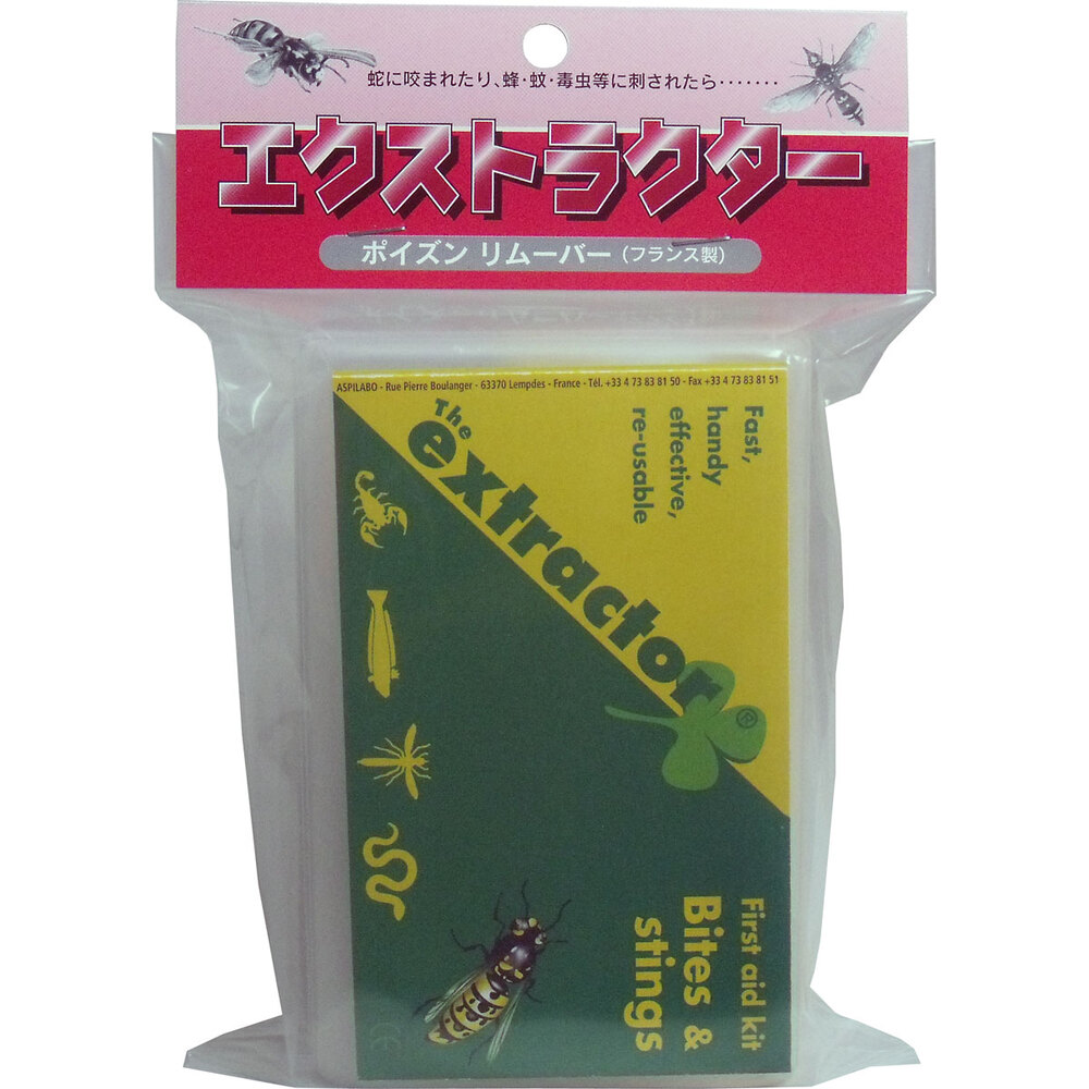 【商品仕様】【ご使用方法】(1)咬まれたり、刺されたりしてもあわてたり、騒ぎ立てないで下さい。動き廻ると体内への毒の拡散が早くなりますので、被害者を静かにさせて下さい。咬まれたり、刺されたりしたら直ぐに、遅くも2分以内に「ポイズンリムーバー」を使用し応急手当をする事が最も効果的です。(2)毒性の強い毒蛇などに咬まれた時は、体内への毒の拡散を遅らせるために傷口の上(心臓に向かって)5〜10cmのところで関節を避けてタオルなどで指が1本入るくらいにしっかりと締めて、血液の循環を弱めて下さい。また、血液の循環を完全に止めないよう10〜15分毎に90秒づつタオルなどを緩めて下さい。(3)ナイフやメス・ピンセットなどで傷口を拡げないで下さい。但し、傷口の付近に体毛がある場合は、吸引効果を高めるために安全カミソリなどで毛をそってからお使い下さい。(4)傷口に応じたカップをご使用下さい。カップは大小4つのサイズがありますので、 たとえば、幼児の指のようなところへは、径の小さいカップをはめて下さい。(5)まず、シリンダーの先にカップをはめて下さい。(6)ピストンレバーを引いてから、カップの面を傷口にあてて下さい。(7)親指でレバーの頭部を押し、レバーの止まるところまで押し下げて下さい。約60〜90秒間そのままにしておくと、皮膚の表面はカップ内に吸引されるのが見えます。(バキューム作動)引き続きこのバキューム作動を、数回繰返して毒液を排出して下さい。※毒蛇に咬まれた場合は、3分以上バキューム作動をして下さい。(8)ピストンレバーを引き上げると「ポイズンリムーバー」は外れます。その時皮膚の表面に吸出された毒液が出ていますから、その毒液を飛び散らさないよう注意して下さい。(9)毒液は石鹸と水を使って、注意深く洗い落として下さい。その後消毒するかバンドエイドを貼って下さい。(10)完全に手当を済ませたら、カップを外して洗い、付いている毒液を全部取り除き、カップを消毒して下さい。但し「ポイズンリムーバー」の本体は洗わないで下さい。本体内部のメカニズムをぬらしたり、プラスチックシリンダーに亀裂が生ずるとポンプに十分な吸引力がなくなり、使用出来なくなります。【注意事項】【注意】・医師の手当てを受けるまでの応急処置です。必ず専門医の治療を受けてください。【メーカ】株式会社飯塚カンパニー【生産地】フランス