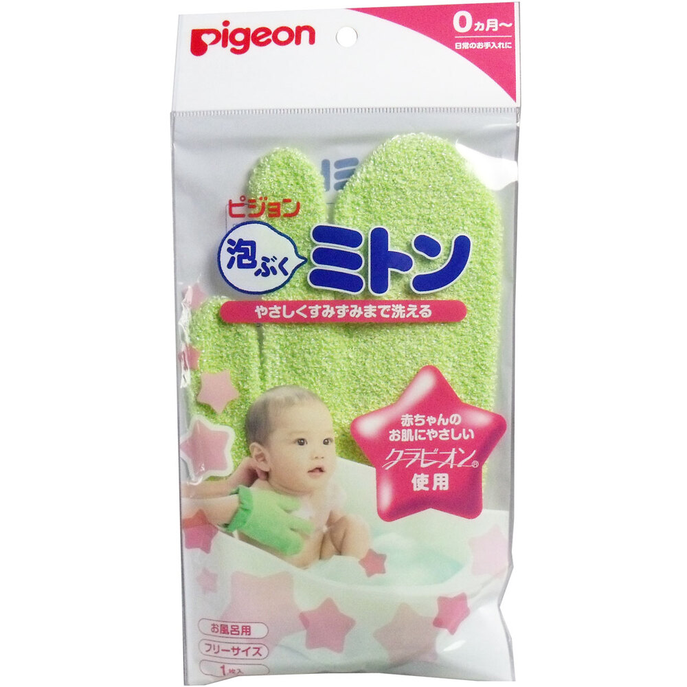 【商品仕様】【サイズ】フリーサイズ【素材】本体・・・綿、ポリプロピレン、ナイロン、レーヨン(クラビオン)、ポリウレタン手首・・・アクリル、ナイロン、その他ひも・・・アクリル【ご使用方法】・ミトンをお湯に浸し、石けんや洗浄料をつけてよく泡立ててご使用ください。・使用後は石けんや洗浄料などを洗い流し、よく水分を切って陰干しで十分乾燥させてください。・乾燥には便利なループひもをご利用ください。【注意事項】【注意】・お子様の手の届かないところへ保管してください。・強くこすらずにソフトにゆっくりとご使用ください。同じ部分を長時間こすりすぎますと、肌を痛めたり、色素沈着がおきることがあります。・皮フに異常のある時やお肌に合わない場合はご使用にならないでください。・使用により痛みやキズ、湿疹などが発生した場合はすぐ使用を取りやめてください。症状によっては、医師の診断を受けてください。・ご使用後はよくすすいで水気を切って乾かしてください。浴室外の風通しのよい場所で陰干ししてください。(生乾きですとにおいの発生のもとになります。)タンブラーなど乾燥機による乾燥はおやめください。・色落ちすることがありますので、長時間の浸けおき洗いは避け、白いものと一緒に洗濯しないでください。・生地の痛みの原因になりますので漂白剤を使用しないでください。・火のそばに置いたり高温になる場所には置かないでください。・本品はボディー洗い用のミトンです。用途以外でのご使用は避けてください。【メーカ】ピジョン株式会社【生産地】日本
