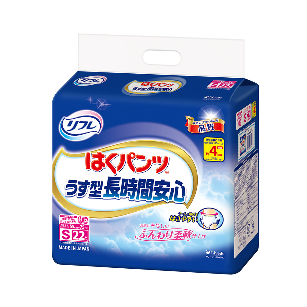 【商品仕様】【医療費控除対象品】【品名】大人用おむつ【適用対象】Sサイズ:ウエストサイズ 55cm〜75cm(男女兼用)【吸収回数の目安】1回の排尿量150mLとして約4回分【素材】表面材:ポリオレフィン系不織布吸水材:綿状パルプ、吸水紙、高分子吸水材防水材:ポリオレフィン系フィルム伸縮材:ポリウレタン糸結合材:スチレン系エラストマーなど【はき方】・「うしろS」と表示している方がうしろです。前後を確かめてください。・普通の下着と同じようにはいてください。【とりかえ方】・使用後はそのまま脱ぐか、両サイドを下から破ってはずします。【使用後の処理】・使用後は小さく丸めてお住まいの地域のルールに従って捨ててください。【注意事項】【使用上の注意】・紙おむつ、包装材は、誤飲のおそれのある幼児、ご老人のお手元に届かないようご配慮ください。・紙おむつを火に近づけると引火のおそれがあります。・紙おむつや肌が汚れているとカブレの原因になるので、こまめに交換し、清潔にしてください。・紙おむつの中の高分子吸収材(乾燥時:粒状/吸収時:ゼリー状)が出て、肌に付着した場合は濡れタオルで拭き取ってください。・誤って紙おむつの一部を食べてしまった場合は、早急に最寄りの医師におみせください。・本製品は洗濯できません。誤って洗濯すると中身が他の衣類に付着します。その場合は、衣類を脱水してから、よくはたいてください。洗濯機の内部はよく拭き取った後、水で洗い流してください。・紙おむつが肌に合わない場合には、ご使用を中止し、医師にご相談ください。★使用上の注意・汚れた紙おむつは早くとりかえてください。・誤って口に入れたり、のどにつまらせることのないよう保管場所に注意し、使用後はすぐに処理してください。★保管上の注意・開封後は、ほこりや虫が入らないよう、衛生的に保管してください。【メーカ】株式会社リブドゥコーポレーション【生産地】日本