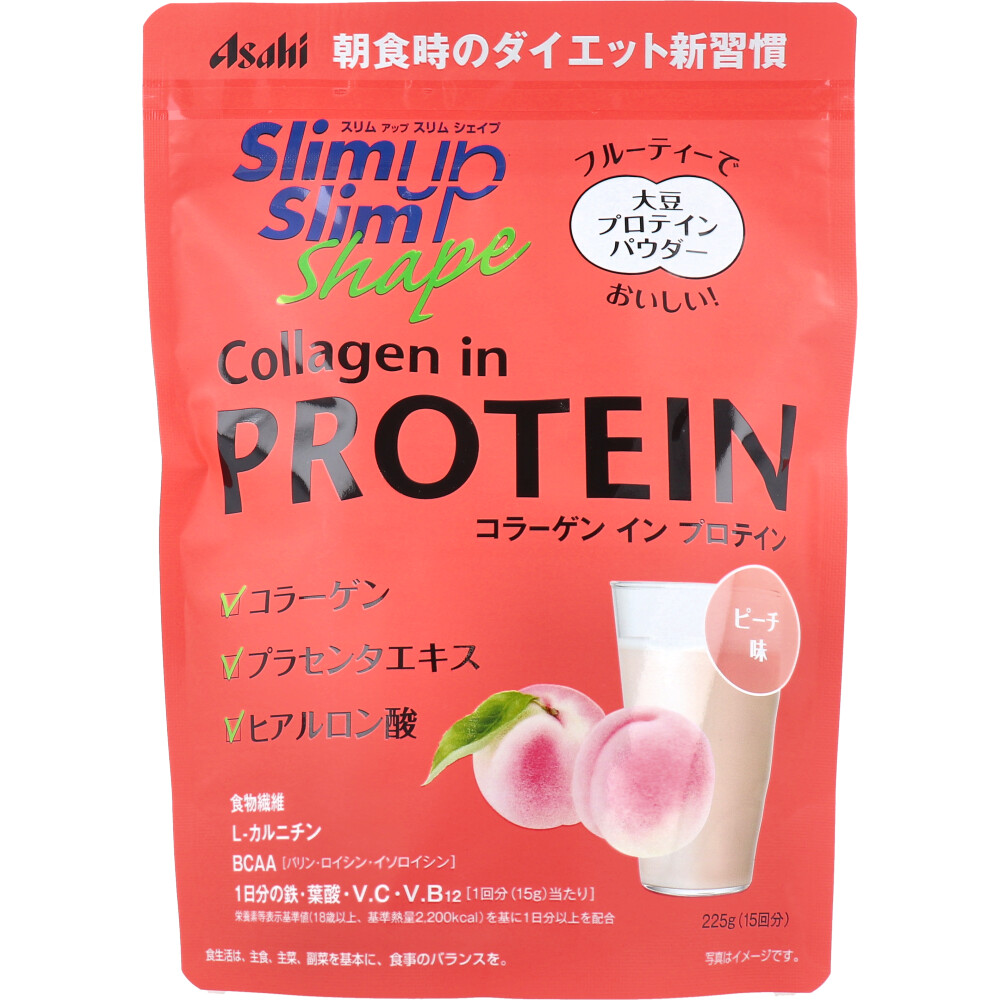 【商品仕様】【名称】タンパク加工食品商品名:スリムアップスリムシェイプ コラーゲン イン プロテイン【原材料】大豆蛋白(国内製造)、砂糖、豚コラーゲンペプチド(ゼラチンを含む)、水溶性食物繊維、ピーチ果汁粉末、豚プラセンタエキス末、植物油脂、L-カルニチンL-酒石酸塩/トレハロース、V.C、乳化剤、糊料(増粘多糖類)、ピロリン酸第二鉄、香料、甘味料(ステビア、アセスルファムK、スクラロース、ラカンカ)、ベニコウジ色素、ヒアルロン酸、ロイシン、バリン、イソロイシン、葉酸、V.B12※アレルギー物質(28品目中):大豆、もも、ゼラチン【栄養成分表示(1回分(15g)当たり)】エネルギー:50kcaLたんぱく質:7.5g脂質:0.42g炭水化物:5.3g(糖質:3.9g、食物繊維:1.4g)食塩相当量:0.22gビタミンB12:3.3μgビタミンC:100mg葉酸:331μg鉄:7.7mgL-カルニチン:2.5mg★製造時配合(15g当たり)コラーゲン:1500mgバリン:1.8mgロイシン:3.6mgイソロイシン:1.8mgヒアルロン酸:5mgプラセンタエキス末:10.5mg(エキス換算:300mg)【お召し上がり方】★グラスに100mL〜150mLの水または牛乳、豆乳を注ぎ、15g(大さじ2杯目安)を混ぜてお飲みください。※時間が経つと粉が沈殿しますので、よくかき混ぜてお早めにお飲みください。※量はお好みに応じで調整してください。【保存方法】直射日光・高温多湿を避け、常温で保存してください。【注意事項】【使用上の注意】・カロリー制限によるダイエットは、ご使用される方の体質や、健康状態によって体調を崩される場合があります。・本品は1食分に必要な全ての栄養素を含むものではありません。・妊娠・授乳中の方は、本品の使用をお控えください。・薬を服用中の方、現在治療を受けている方は医師にご相談ください。・食物アレルギーの認められる方は、パッケージの原材料表記をご確認の上、ご使用ください。・体質や体調によりまれにおなかが緩くなるなど、身体に合わない場合があります。その場合は使用を中止してください。・小児の手の届かないところに置いてください。・開封後はチャックをしっかり閉め、お早めにお召し上がりください。・水や牛乳、豆乳に混ぜたとき、沈殿、だまができることがありますが、品質上問題ありません。・シェイカーを使用する場合は、常温又は冷たい飲み物でお作りください。【メーカ】アサヒグループ食品株式会社