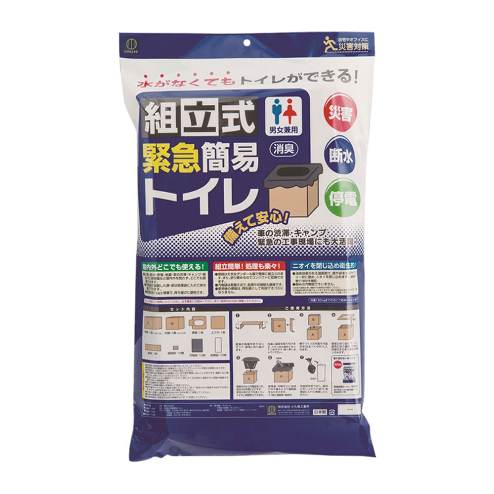 【商品仕様】【セット内容】外箱1箱(大きい方)、内箱1箱(小さい方)、便座1枚、上フタ1枚、底板1枚、凝固剤10コ、汚物袋10枚、処理袋10枚【原材料】便座:段ボール/汚物袋・処理袋:ポリエチレン/凝固剤:吸水性樹脂/消臭剤:ウッドパウダー【サイズ】便器:(約)横32×横32.5×奥行き34.5cm(組立時)汚物袋:横65×縦50cm処理袋:横18×縦45cm【使用方法】(1)底板の両端を折り目にそって、直角に折り曲げます。(2)内箱に底板を取り付けます。(3)(2)で作った内箱を外箱の中に入れます。(4)便座の折り目にそって、直角に折り曲げ、外箱と内箱のすきまへ便座を差し込みます。(5)便座の穴から汚物袋を入れ、袋の口は外側に広げます。男性は袋の片方を高くセットすると飛散防止できます。(6)使用後、汚物袋の上に全体に行き渡るように凝固剤をふりかけます。(7)汚物袋を取り出し、袋の口をしっかりと結び、処理袋に入れて破棄してください。【こんなときに】・水がなくてもトイレができる!・災害、断水、停電、地震などの防災グッズとして。・登山、キャンプなどの野外活動。・長時間のドライブ、車の渋滞。・緊急の工事現場に。・自宅やオフィスに備えて安心。【注意事項】【注意】・汚物袋・処理袋は鋭利なものに触れないようにしてください。・凝固剤は洋式トイレの便器の中に直接投入しないでください。トイレが詰まる原因となります。・汚物袋は1回のご使用ごとにお取替えください。・薬の副作用や疾病などの影響により、尿や便が凝固しないことがあります。凝固しない場合でも水洗トイレに流さないでください。・便器にはゆっくりと腰掛けてください。勢いよく又は斜めに着座すると便器が破損する場合があり大変危険です。・平らな場所でご使用ください。・車内でご使用の際は、停車時にご使用ください。・お子様やペットなどが製品で遊んだりすると誤って袋をかぶり窒息する恐れがありますので、必ず手の届かない所に保管してください。・火気に注意し、高温・多湿・直射日光のある所を避けて保管してください。・本来の用途以外に使用しないでください。・廃棄の際は各自治体の廃棄区分に従って処理してください。【メーカ】株式会社小久保工業所【生産地】日本