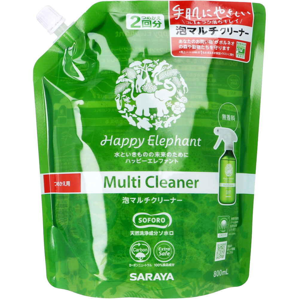 【商品仕様】【品名】住宅用合成洗剤【用途】キッチン周り(レンジまわり、調理台、電子レンジ、調理棚、冷蔵庫など)、水拭きできる家具や床、お風呂、トイレなど。【液性】中性【成分】界面活性剤(1%、ソホロースリピッド)、安定剤、キレート剤【使用量の目安】原液(1平方メートルに対して約6回噴射)【つめかえ方】・かならず、ハッピーエレファント 泡マルチクリーナー(400mL)のボトルにつめかえてください。・つめかえ前にボトルの中をよく水洗いし、乾かしてからつめかえてください。(1)開ける。※かならず注ぎ口の根元部分を持って開けてください。(2)つめかえる。注ぎ口の根元部分を持ちます。ボトルの転倒に注意して、パックの下部に手を添えてゆっくり注いでください。※液が溢れないようにご注意ください。【使用できないもの】水拭きできないもの、木材など水がしみ込みやすいもの、大理石、漆器、革製品、自動車、液晶・プラズマディスプレイの表面、銀製品、銅、アルミ等。【応急処置】・目に入った場合、直ちに流水で15分以上洗い流す。・飲み込んだ場合、吐かずに口をすすぎ、水を飲むなどの処置をする。・液が皮ふについた場合、直ちに水で十分に洗い流す。・いずれも異常が残る場合は、本品を持参のうえ、専門医に相談する。【注意事項】【使用上の注意】・用途以外に使わない。・吸入したり目に入らないように注意する。・希釈したり、他の薬剤と混ぜて使用しない。・荒れ性の方や長時間使う時は、炊事用手袋を使用する。・使用後は手を水でよく洗う。・目より高い所は、布巾等につけて使用する。・極端に高温または低温の場所、直射日光の当たる場所には保管しない。成分の析出や、液の凍結が起こる場合がある。・子どもや認知症の方などの誤飲を防ぐため、置き場所に注意する。・天然成分を使用しているため、経時的に色や臭いが変化したり、もやがみられることがあるが、性能に問題ない。・パックはやわらかい材質のため、まれに破損して液がもれることがあるので、持ち運びや保管時には注意する。・これは飲み物ではありません。★つめかえ注意・他の洗剤などと混ぜないでください。液が濁ったり固まることがあります。・濡れた手でパックを持つとすべりやすいのでご注意ください。・パックを強く持つと液が飛び出すことがありますのでご注意ください。・バックの端(断面)で手を切る恐れがありますのでご注意ください。・つめかえた後は、パックのキャップをしっかり閉め、立てて保管してください。・液を使い終わるまでパックの表示を保管してください。【メーカ】サラヤ株式会社【生産地】日本