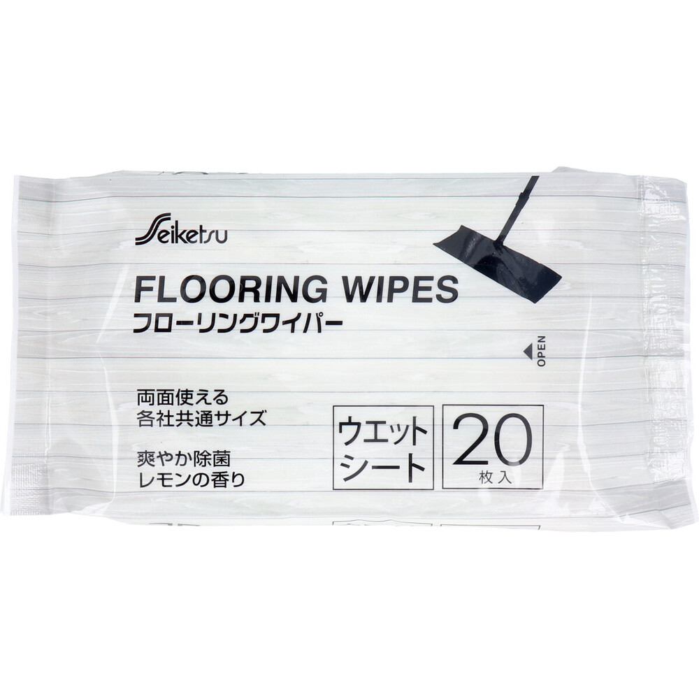 【商品仕様】【成分】エタノール、除菌剤、消臭剤、防腐剤、精製水、界面活性剤【組成】ポリエステル【サイズ】200X300mm【使用方法】(1)シートを1枚取り出し、各種ワイパーの取り付け方法に従ってしっかりと固定してください。(2)フローリングの目的に沿って、軽く滑らすように拭いてください。【注意事項】【ご注意】・本品は人体用のウェットティッシュではありません。・用途以外には使用しないでください。・シートは乾燥すると洗浄効果がなくなるので、袋から取り出したらすぐにお使いください。・床が変色する場合がありますので使用後はワイパーから取り外してください。・手荒れの気になる方や、長時間ご使用の場合にはゴム手袋をはめてください。・幼児の手の届く所や火の近く、日の当たる所、高温になる所には置かないでください。・乾燥を防ぎ品質を保持するため、フタをきちんと閉めてください。【メーカ】株式会社セイケツネットワーク【生産地】中国