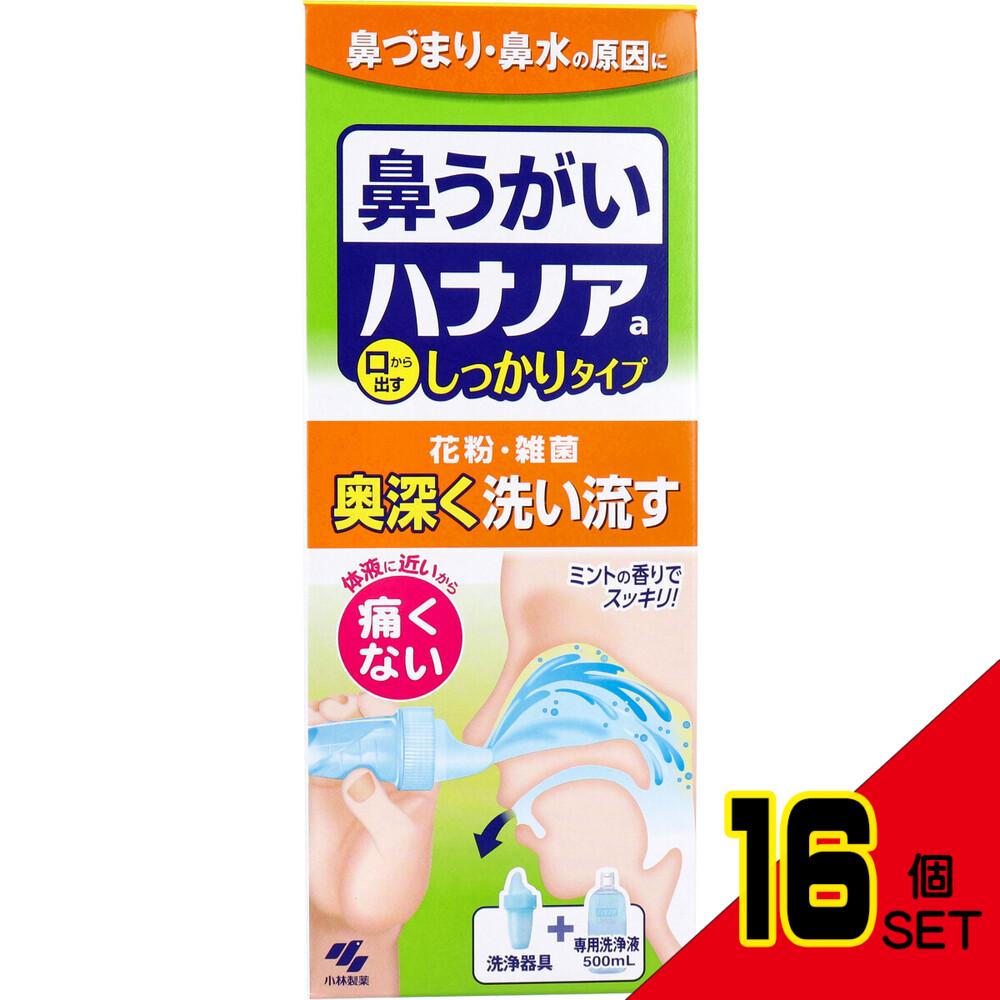 【商品仕様】【一般医療機器】製造販売届出番号:04B2X00009001001医療用洗浄器 鼻用洗浄器販売名:ハナノアa【形状・構造及び原理等】★形状及び構造・円筒状で、鼻腔内挿入するための供給突起を有し、ノズル部(ポリエチレン)と本体部の2部品から構成される★原理・外鼻孔から洗浄液を流し込んで鼻腔内を洗浄する鼻用洗浄器【効果】・風邪や花粉の季節には、鼻の奥深くまで雑菌や花粉が入り込みトラブルを引き起こします・ハナノアは、鼻の奥に入り込んだ雑菌や花粉をしっかり洗い流すための商品です【成分】精製水、塩化Na、グリセリン、香料、ポリソルベート80、ベンザルコニウム塩化物(0.0035%)、エデト酸Na【使用方法等】(1)器具に液を入れる・目盛り線(20mL 両鼻分)を目安に洗浄液を入れ、ノズルをつけてください(2)液を鼻の中に流し込む・ノズルの「うえ」の文字が読める向きに洗浄器具を持ち、鼻の穴にフィットさせてください・正面を向き、洗浄器具の中央部を押して洗浄液を鼻の中に流し込んでください(3)洗浄液を吐き出す・口に流れ込んだ洗浄液を吐き出してください※洗浄液は口だけでなく、鼻の穴からも出ることがあります※鼻から出すことでも洗浄効果はあります※液漏れのおそれがあるため、液を流し込む際、器具を強く押しすぎないこと(4)洗浄液を最後まで使い切る・20mLを使い切るまで、左右の鼻の穴を交互に洗浄してください※1日1〜3回を目安に使用してください★上手に洗うポイント・「アー」と声を出しながら流し込むと、耳の奥に洗浄液が流れにくくなり、無理なく鼻うがいができます【注意事項】【使用方法に関する注意】(1)上を向いて使用しないでください。また洗浄後、強く鼻をかまないでください[耳の内部に洗浄液が入り、中耳炎になる恐れがある](2)鼻から吸い込まずに自然に流し込んでください[洗浄液が気管支や肺に入る恐れがある](3)洗浄液が鼻や口から流れ落ちますので、洗面台等で使用することをおすすめします(4)洗浄液を勢いよく流し込んだり、鼻から洗浄液を強く吸い込むと、鼻に痛みを感じる場合があります※洗浄液を使い切った際は、「ハナノア専用洗浄液」(別売)をお買い求めください【使用上の注意】(1)15才未満の小児には使用させないこと(2)嚥下障害がある方(食べ物や飲み物を飲み込みにくい方)は使用しないこと[洗浄液が気管支や肺に入る恐れがある](3)耳鼻咽喉科の治療を受けている方は、使用前に医師に相談すること(4)洗浄後、強く鼻をかまないこと(5)鼻の洗浄のみに使用し、目や耳には使用しないこと(6)鼻の炎症、鼻づまりがひどいときは使用しないこと【メーカ】小林製薬株式会社【生産地】日本