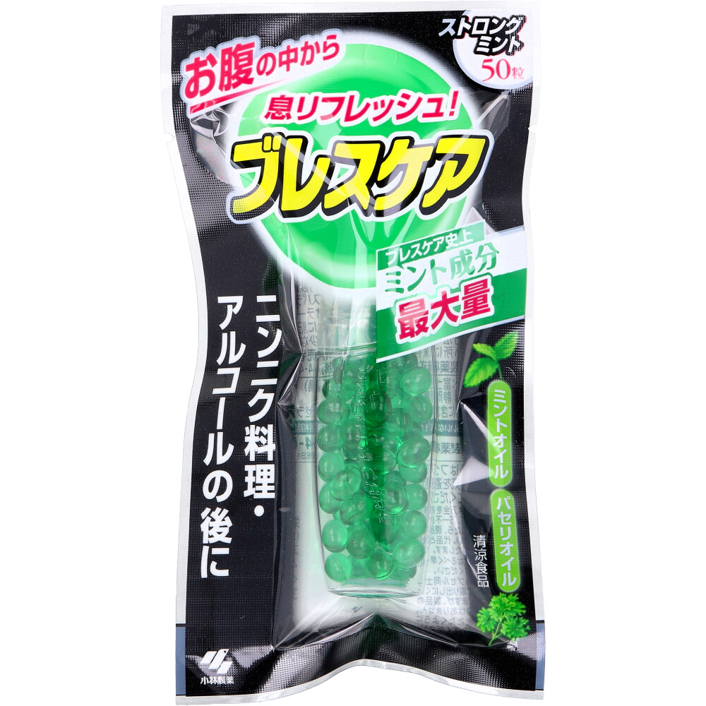 【商品仕様】【品名】清涼食品【原材料名】植物油脂(国内製造)、ゼラチン、パセリ油/香料、グリセリン、アスパラギン酸Na、着色料(緑3、黄4)、甘味料(ネオテーム)【栄養成分表示(50粒当り)】エネルギー:47kcaLたんぱく質:1.8g脂質:3.7g炭水化物:1.7g食塩相当量:0.0031〜0.12g【食べ方】かまずに水などの飲み物と一緒に飲みこんでください。1回の目安量:2〜3粒、気になるときは3〜4粒。【保存方法】直射日光を避け、湿気の少ない涼しい所に保存してください。【アレルギー物質】ゼラチン【注意事項】【注意】・開封後はフタを閉め、湿気を避けて保存してください。・開封後はなるべく早くお召し上がりください。・まれにカプセル同士がくっついて取り出しにくい場合がありますが、製品の品質に異常はありません。軽く容器をたたくようにして取り出してください。・本品は血中のアルコール濃度には影響を与えません。【メーカ】小林製薬株式会社【生産地】日本