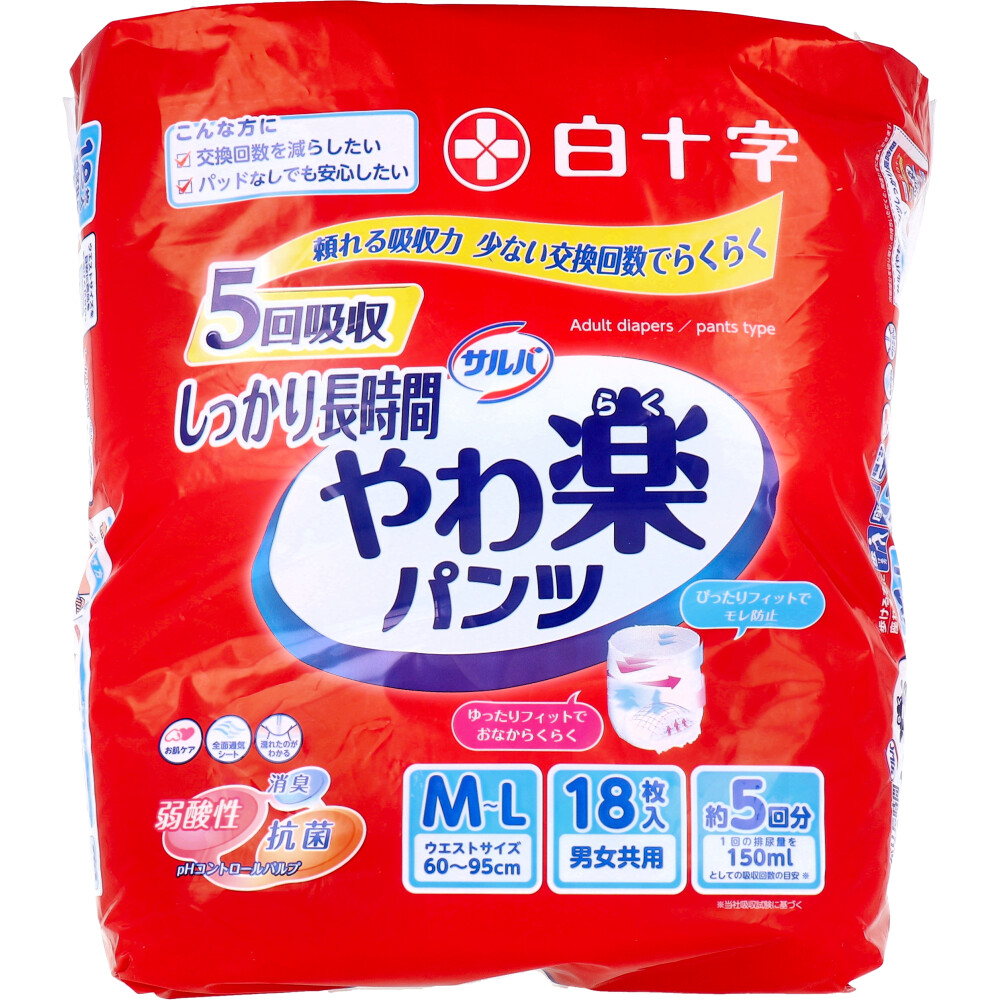【商品仕様】【医療費控除対象品】【品名】大人用紙おむつ【適用】ウエストサイズ:60〜95cm【素材】表面材: ポリオレフィン、ポリエステル不織布、ポリオレフィン系不織布吸水材:綿状パルプ、高分子吸水材、吸水紙、ポリオレフィン、ポリエステル不織布防水材:ポリオレフィンフィルム伸縮材:ポリウレタン結合材:スチレン系合成樹脂等【吸収回収の目安】約5回分(1回の排尿量を150mLとしての吸収回数の目安(※白十字社吸収試験に基づく))【使用方法】★はき方・「うしろ」と書いたマークのある方を後ろ側にしてはいてください。★はずし方・排尿の際には、側面部分のつなぎ目を破いてください。※上下どちらからでも破けます。・大便の際には、こぼれない様に股部をおさえ、側面部分のつなぎ目を下から破いてください。【使用後の処理】 ・紙おむつに付着した大便はトイレに始末してください。・汚れた部分を内側にして丸め、不衛生にならないように処理してください。・トイレに紙おむつを流さないでください。・使用後の紙おむつの廃棄方法はお住いの地域のルールに従ってください。・外出時に使った紙おむつは持ち帰りましょう。【注意事項】【注意】★ご使用前に必ずお読みください。・肌着をおむつの中に入れないでください。・おむつが汚れていなくても使ったら毎日取りかえましょう。・洗濯はできません。・温度の高い所や水に濡れやすい場所には保管しないように気をつけてください。・肌に残った大便はキレイに拭き取ってください。・お出掛けの際は処理袋をご持参ください。・肌に合わない方は使用を中止して下さい。★使用上の注意・皮膚等に異常が見られる場合は、医師等に相談してください。・汚れた紙おむつは早くとりかえてください。・誤って口に入れたり、のどにつまらせることのないよう保管場所に注意し、使用後はすぐに処理してください。★保管上の注意・開封後は、ほこりや虫が入り込まないよう、衛生的に保管してください。【メーカ】白十字株式会社【生産地】日本