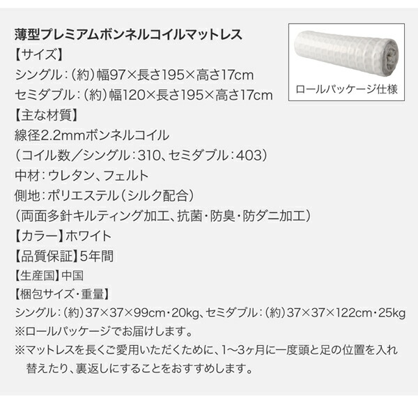 薄型プレミアムボンネルコイルマットレス付き