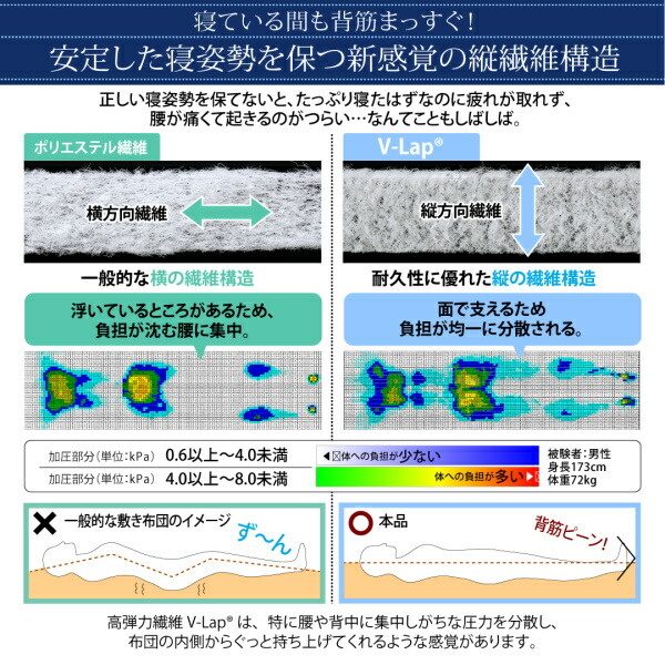 敷き布団 マットレス テイジン V-Lap使用 日本製 体圧分散で腰にやさしい 朝の目覚めを考えた超軽量・高弾力敷布団 シングル