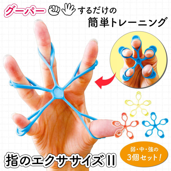 指のエクササイズII 老若男女使える指のエクササイズ!グーパー、グーパーするだけの簡単トレーニングで幅広く使用していただけます。弱・中・強の3つの強度で段階を経たトレーニングが可能。指の関節が動かしにくい方、細かい手作業をする方、手先が冷える方に。パソコンやスマホ等の操作で指を酷使しがちな方にも!使い方は自由自在!あなたに合ったエクササイズができます。 生産国:中国 素材・材質:TPR(熱可塑性エラストマー) 商品サイズ:約縦7×横7×厚み0.8cm 重量:約4g セット内容:3個セット(弱・中・強各1個) 老若男女使える!指トレグッズ。