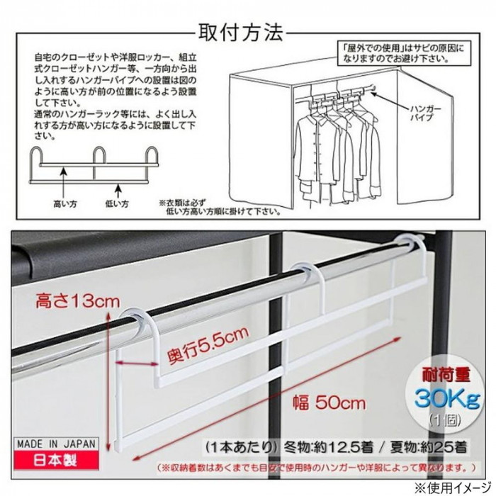 収納アップハンガーワイド(2個組) ホワイト SH-50 ハンガーバーに掛けるだけで衣類の収納がアップします。段違いに掛けるので掛外ししやすく、洋服の区別も可能です。衣類の収納スペースを最大限に活用し、整理整頓を手軽に行いたい方にオススメです。 生産国:日本 素材・材質:本体:スチール 商品サイズ:幅50×奥行5.5×高さ13cm 仕様:ポリエチレン樹脂コーティング収納目安冬物:約28着夏物:約58着全体許容耐荷重:30kg(1個)組立式 おすすめ キーワード【家具 インテリア 子供部屋家具 ポールハンガー】