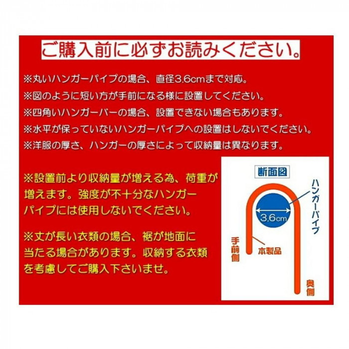 ハンガーバーに掛けるだけで衣類の収納がアップします。段違いに掛けるので掛外ししやすく、洋服の区別も可能です。衣類の収納スペースを最大限に活用し、整理整頓を手軽に行いたい方にオススメです。 ※収納目安は衣類やハンガーの形によって異なります。 |