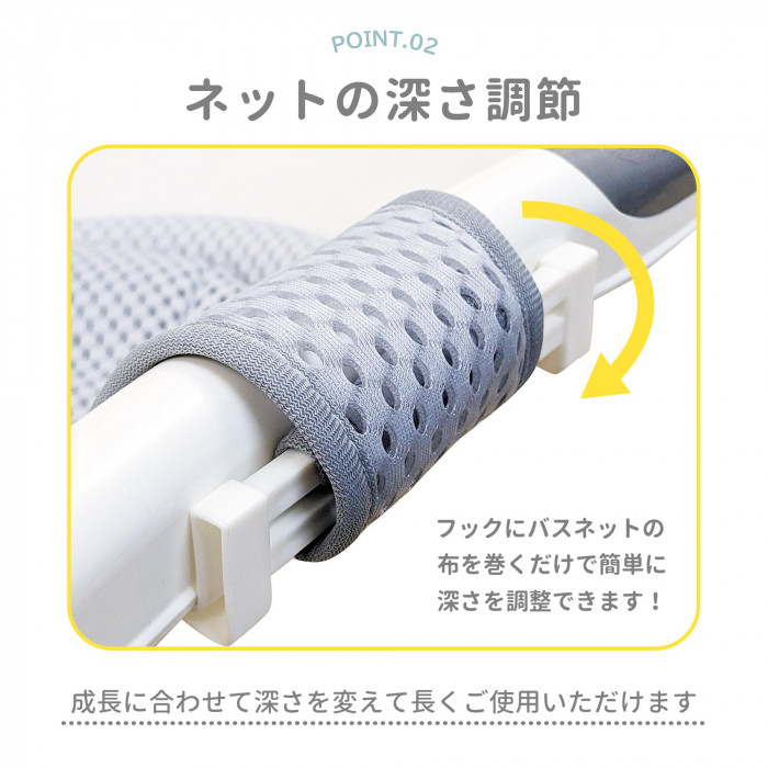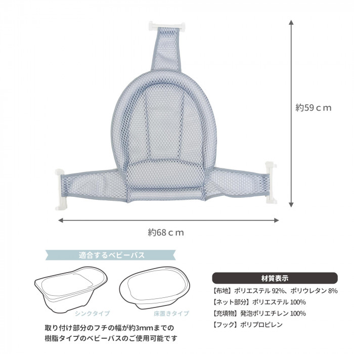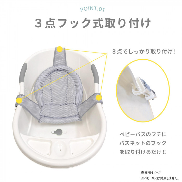 パパ、ママの手を支えるので沐浴がラクに行えます。やわらか素材で安心して使えます。3点フックでしっかり取り付けられます。ベビーバスのサイズに合わせて深さ調節が可能です。通気性のあるメッシュシートで、洗った後も早く乾きます。