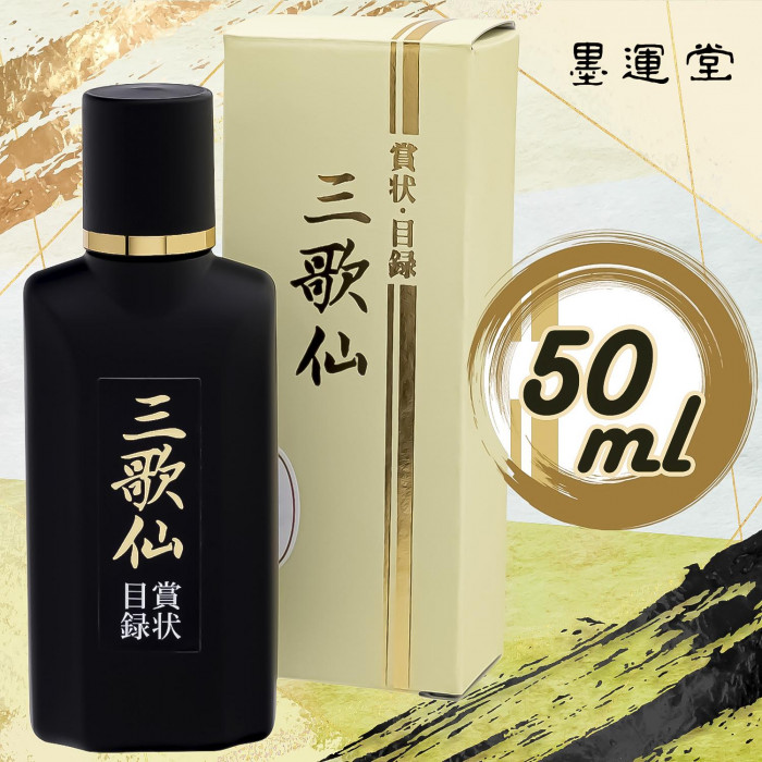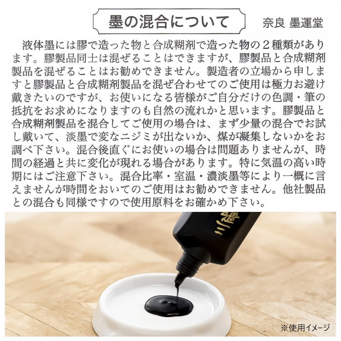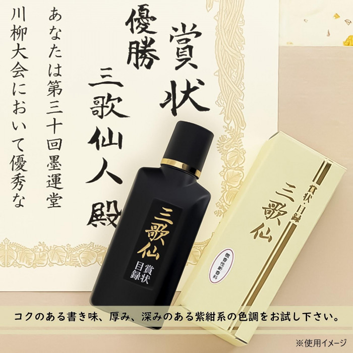 目録・賞状用墨液。小筆に適した書きやすい液体墨として開発されました。コクのある書き味、厚み、深みのある紫紺系の色調をお試しください。