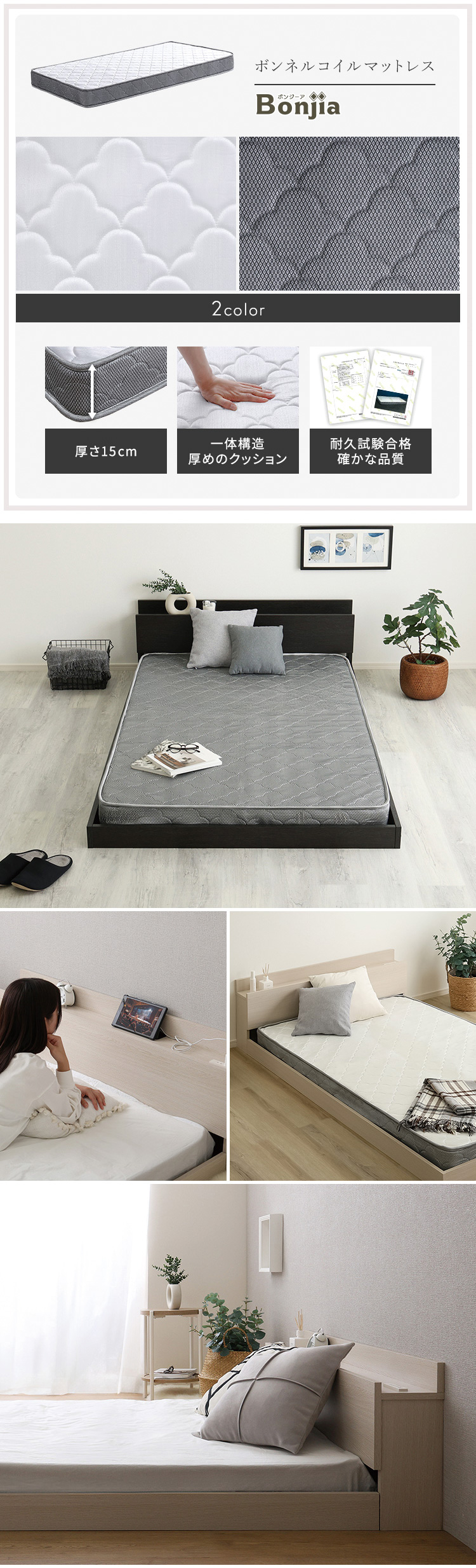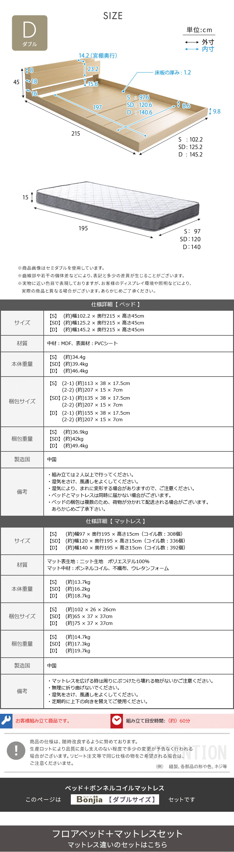 マットレスD:(約)幅140×奥行195×高さ15cm(コイル数:392個)