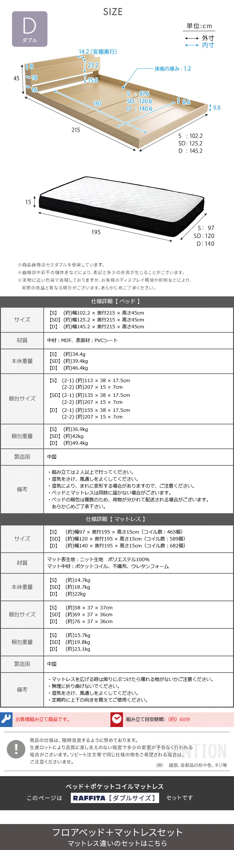 マットレスD:(約)幅140×奥行195×高さ15cm(コイル数:682個)