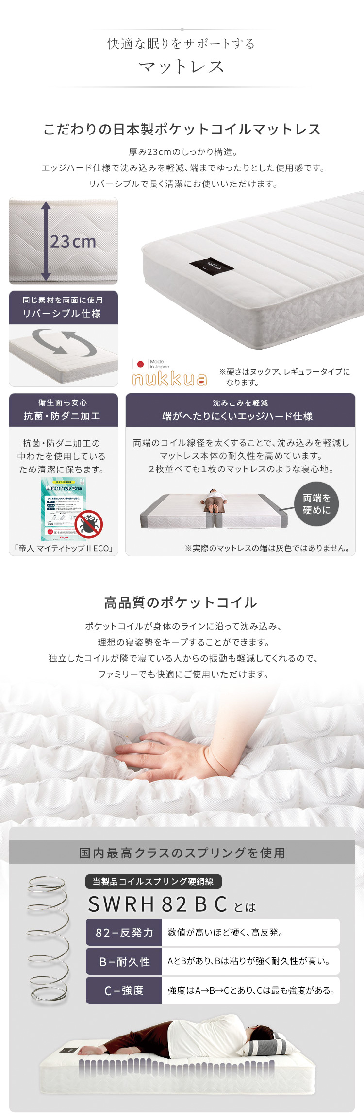 マットレス中材:ポケットコイル、ウレタン、防ダニ抗菌綿、不織布